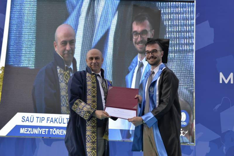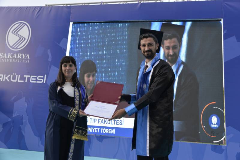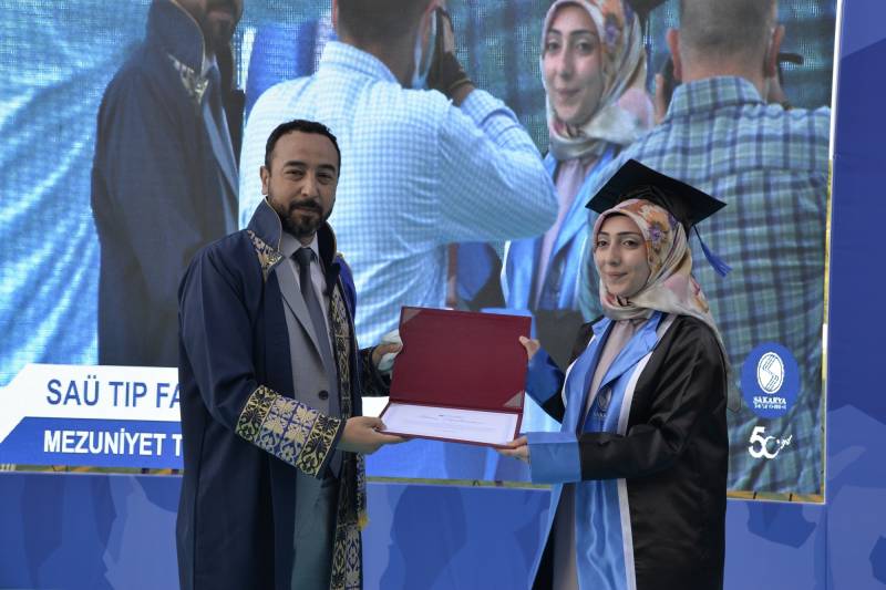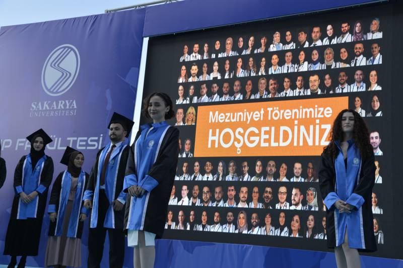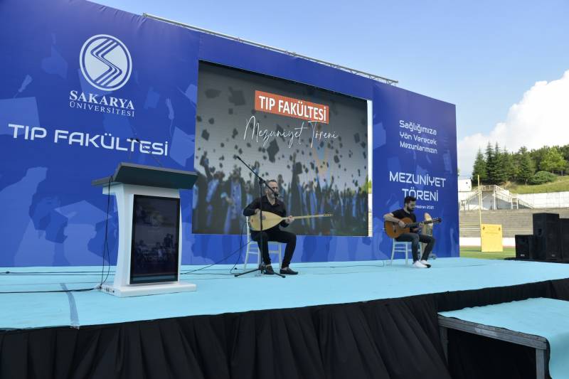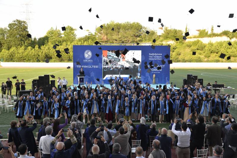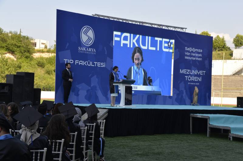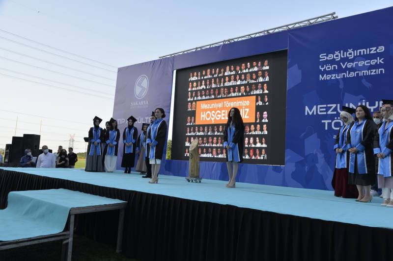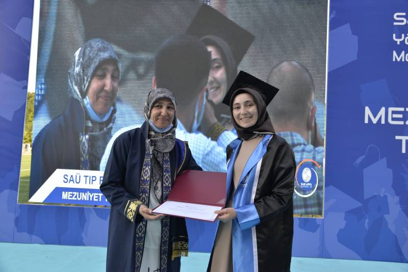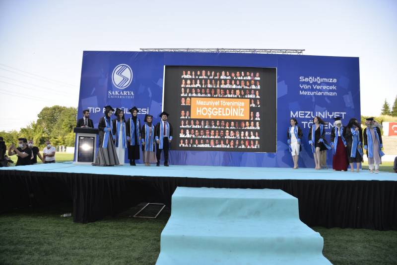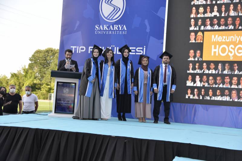 SAÜ’de eÄŸitim gördükten sonra uygulamalı ÅŸekilde hastalara bakmaya devam ederek pandemi servislerinde çalışan ve korona virüs aşısı olan 108 tıp fakültesi öÄŸrencisi pandemi sonrasında ilk kez yüz yüze törenle mezun oldu. Üniversitenin stadyumunda gerçekleÅŸen mezuniyet törenine; Sakarya Vali Yardımcısı Ersin EmiroÄŸlu, AK Parti İl BaÅŸkanı Yunus Tever, Sakarya BüyükÅŸehir Belediye BaÅŸkanı Ekrem Yüce, SAÜ Rektör Yardımcısı Prof. Dr. Hatem Akbulut, Prof. Dr. Barış Tamer Tonguç, Prof. Dr. Temel Gürdal, SAÜ Genel Sekreteri Dr. ÖÄŸr. Üyesi YaÅŸar Kahraman, SUBÜ Rektör Yardımcısı Prof. Dr. Ali Fuat Boz, Tıp Fakültesi Dekanı Prof. Dr. OÄŸuz Karabay, SaÄŸlık İl Müdürü Doç. Dr. Aziz ÖÄŸütlü, SEAH BaÅŸhekimi Doç. Dr. Fikret Halis, mezuniyet heyecanı yaÅŸayan öÄŸrenciler ve yakınları katıldı. Canlı müzik dinletisiyle baÅŸlayan tören İstiklal Marşı ve Saygı DuruÅŸu ile devam etti. Açılış konuÅŸmasının ardından bölümünü birincilikle bitiren ve doktor unvanı kazanan Sümeyye Karapınar, baÅŸarı öyküsünden söz ederek törende bulunanlara duygusal anlar yaÅŸattı.