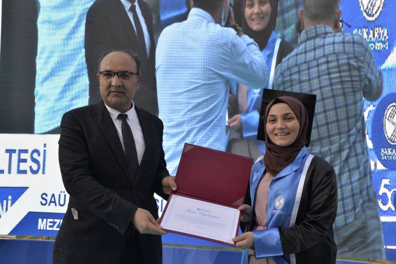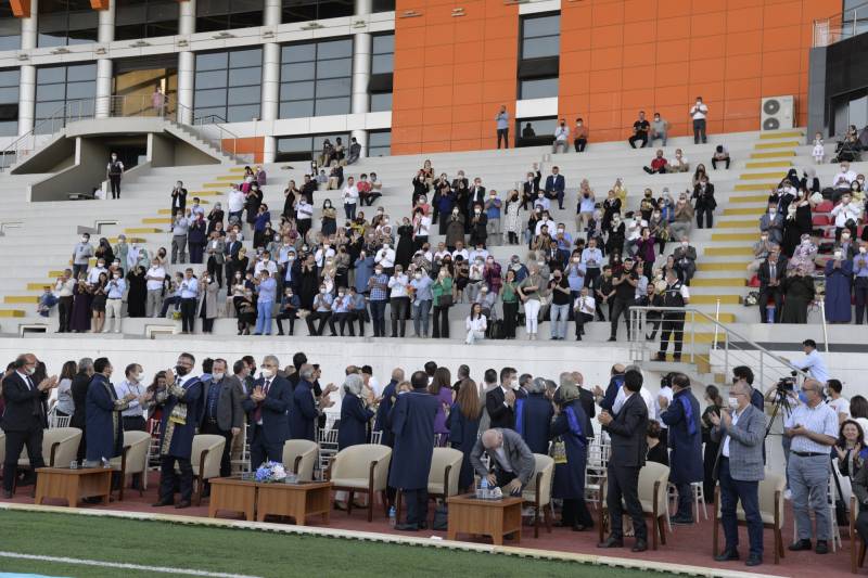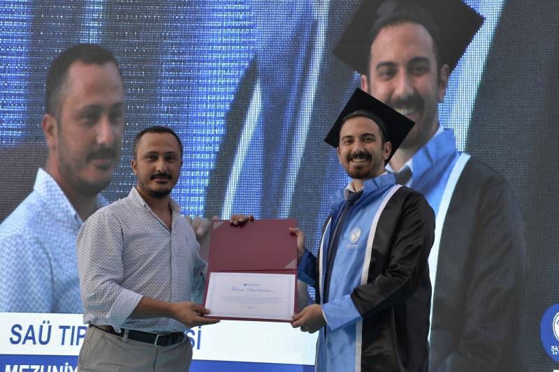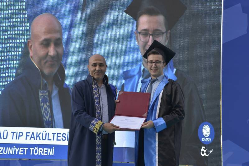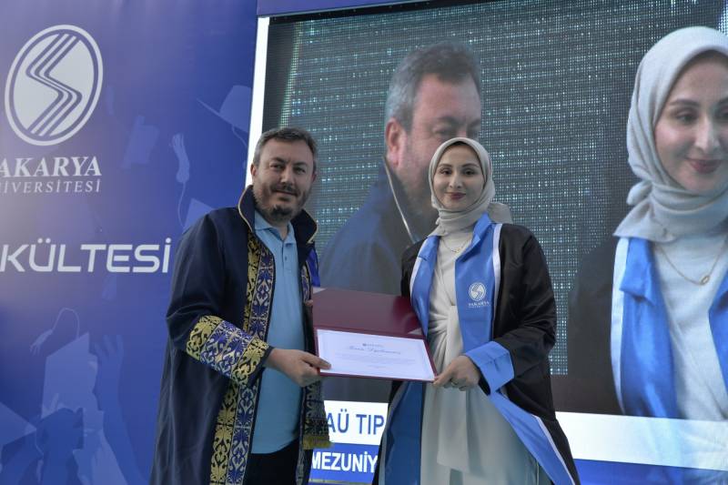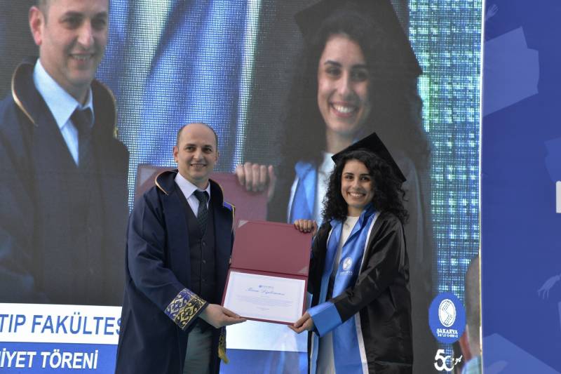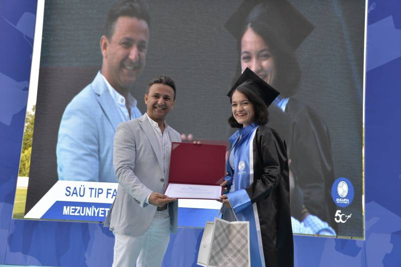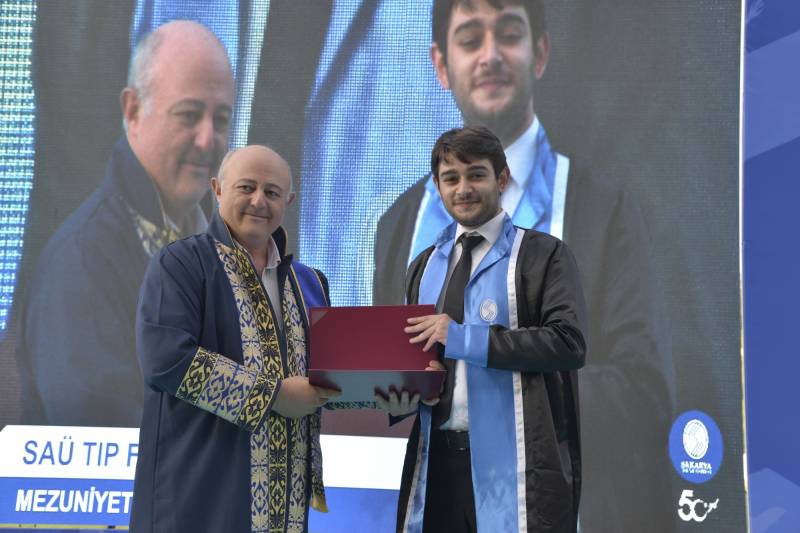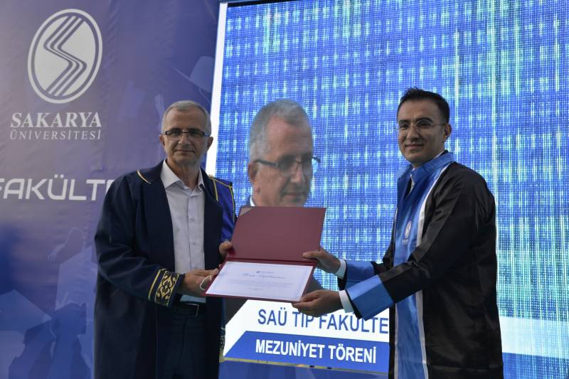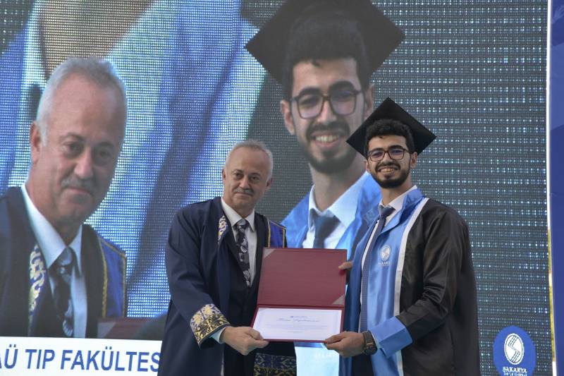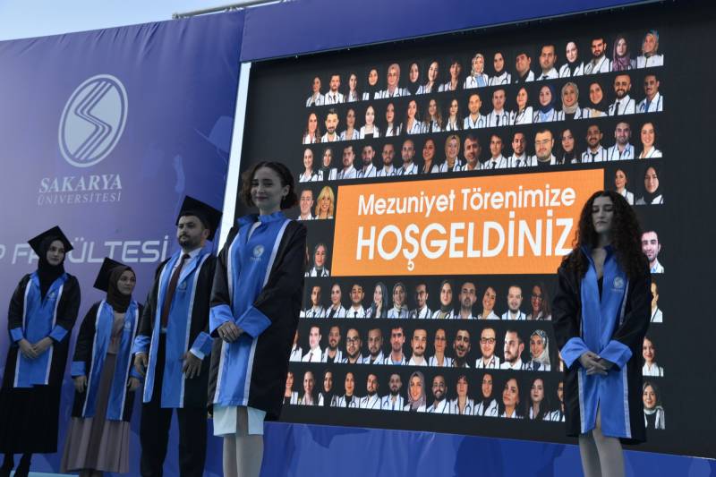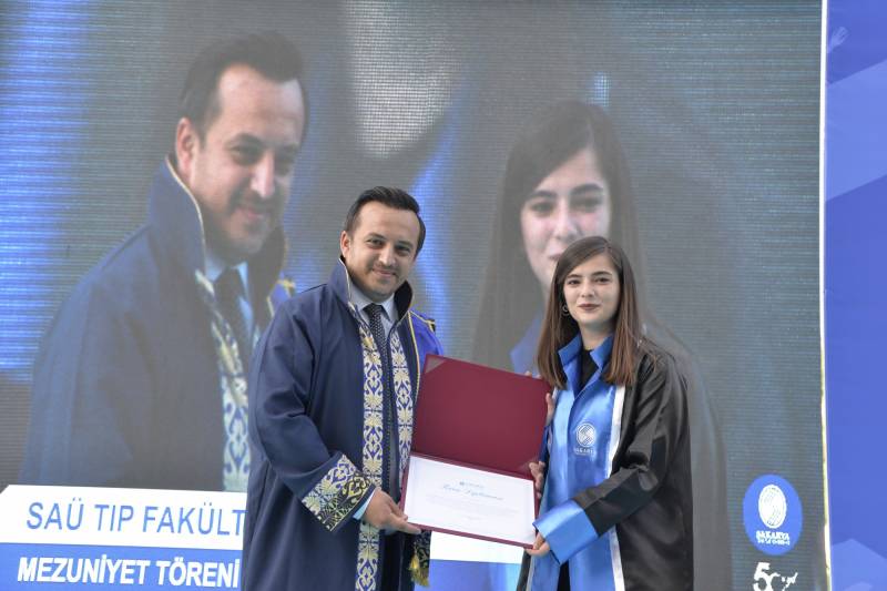 SAÜ’de eÄŸitim gördükten sonra uygulamalı ÅŸekilde hastalara bakmaya devam ederek pandemi servislerinde çalışan ve korona virüs aşısı olan 108 tıp fakültesi öÄŸrencisi pandemi sonrasında ilk kez yüz yüze törenle mezun oldu. Üniversitenin stadyumunda gerçekleÅŸen mezuniyet törenine; Sakarya Vali Yardımcısı Ersin EmiroÄŸlu, AK Parti İl BaÅŸkanı Yunus Tever, Sakarya BüyükÅŸehir Belediye BaÅŸkanı Ekrem Yüce, SAÜ Rektör Yardımcısı Prof. Dr. Hatem Akbulut, Prof. Dr. Barış Tamer Tonguç, Prof. Dr. Temel Gürdal, SAÜ Genel Sekreteri Dr. ÖÄŸr. Üyesi YaÅŸar Kahraman, SUBÜ Rektör Yardımcısı Prof. Dr. Ali Fuat Boz, Tıp Fakültesi Dekanı Prof. Dr. OÄŸuz Karabay, SaÄŸlık İl Müdürü Doç. Dr. Aziz ÖÄŸütlü, SEAH BaÅŸhekimi Doç. Dr. Fikret Halis, mezuniyet heyecanı yaÅŸayan öÄŸrenciler ve yakınları katıldı. Canlı müzik dinletisiyle baÅŸlayan tören İstiklal Marşı ve Saygı DuruÅŸu ile devam etti. Açılış konuÅŸmasının ardından bölümünü birincilikle bitiren ve doktor unvanı kazanan Sümeyye Karapınar, baÅŸarı öyküsünden söz ederek törende bulunanlara duygusal anlar yaÅŸattı.