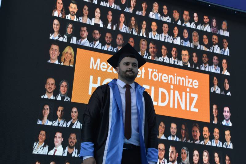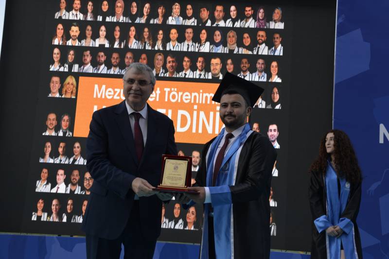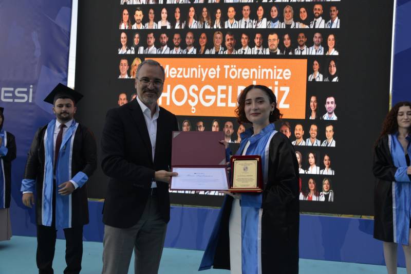 Mezun olan öÄŸrencilere hitap eden Sakarya Vali Yardımcısı Ersin EmiroÄŸlu, “Bu evlatlarınız doÄŸduÄŸunda, sizin kucağınıza geldiÄŸinde bir göz nuru bir göz aydınlığı dilendi. Hepinizin gözü ışıl ışıldı. Gerçekten göz aydınlığıydı sizler için. Bugün hepsi bir doktor olarak artık Sakarya’nın ve bu ülkenin göz aydınlığı, ne mutlu bizlere” ifadelerini kullandı.