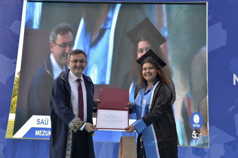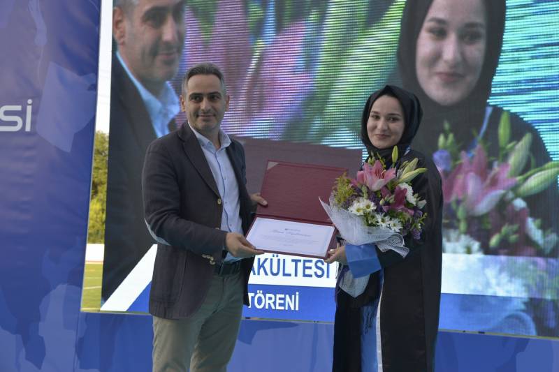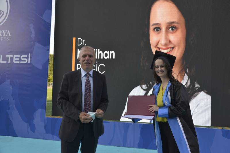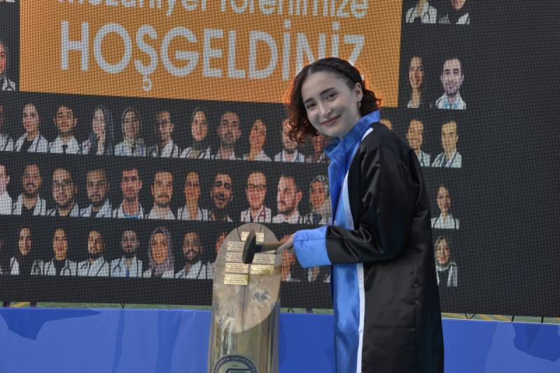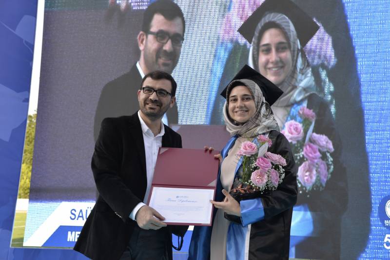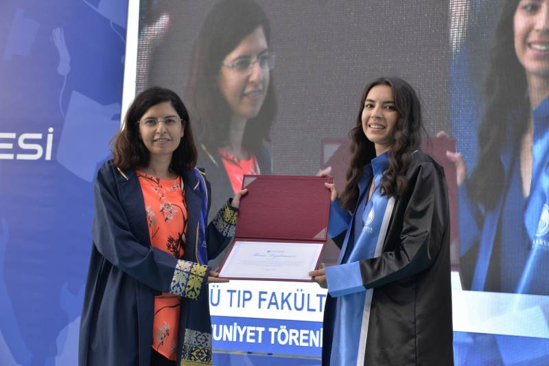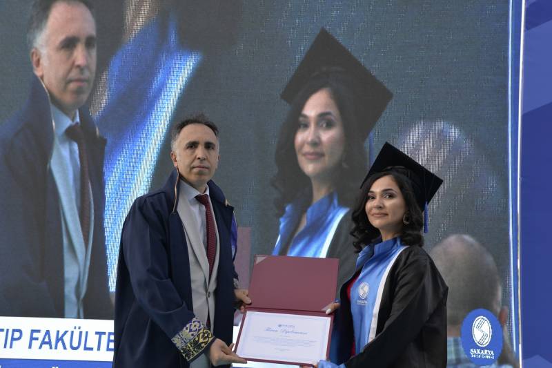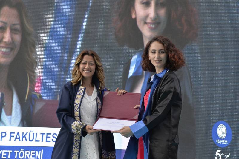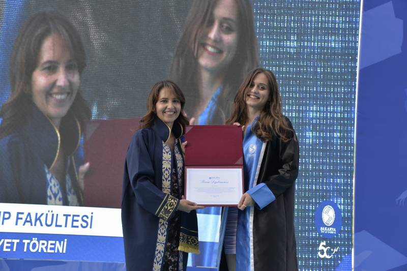 Sakarya Üniversitesi 2020-2021 eÄŸitim ve öÄŸretim yılı Tıp Fakültesi bölüm birincisi Dr. Sümeyye Karapınar, “6 yıllık serüvenimizin sonuna geldik. Bizler bugün hekim olmanın mutluluÄŸu, heyecanı ve gururu içerisindeyiz. Bu zorlu serüvende, bize iyi hekim olmak yönünde büyük emeÄŸi geçen, ufkumuzu geniÅŸleten, bize örnek olan, kapılarını bize hep açık tutan, bildikleri ve yetenekleri karşısında hayretler içerisinde kaldığımız, sorularımız ile meraklarımızı hep sabırla karşılayan çok deÄŸerli hocalarıma ÅŸahsım ve bütün arkadaÅŸlarım adına teÅŸekkür ediyorum” dedi.