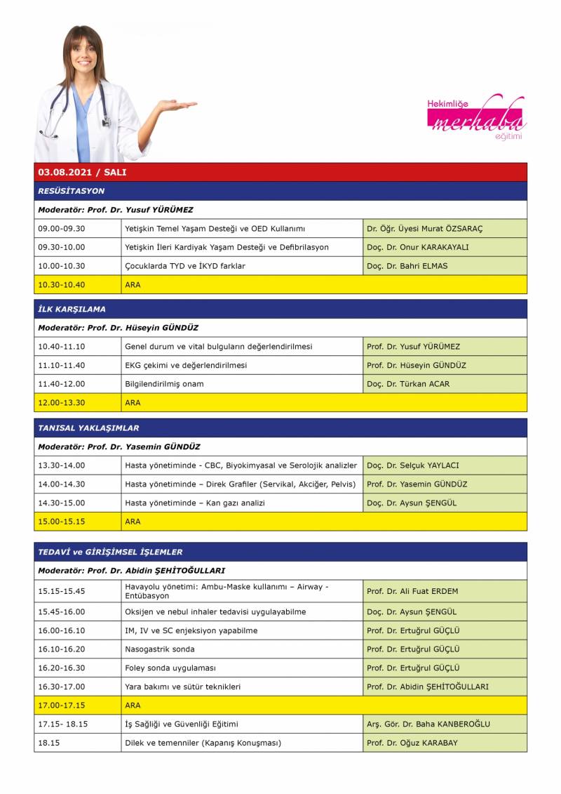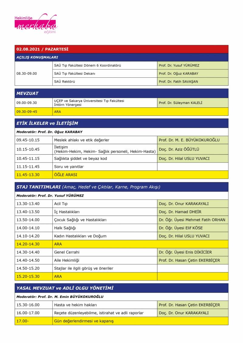 02-03 AÄŸustos 2021 tarihleri arasında fakultemiz dönem 6 öÄŸrencilerimize yönelik HEKİMLİĞE MERHABA EĞİTİMİ Sakarya Üniversitesi Esente Kampüsü Kültür ve Kongre Merkezi Gültekin YILDIZ Salonunda 08,30-18,00 saatleri arasında gerçekleÅŸtirilecektir.
