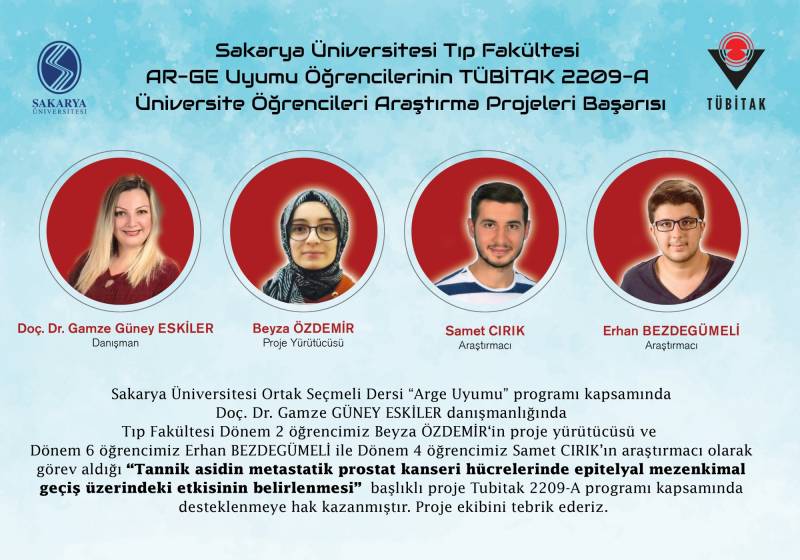 Sakarya Üniversitesi Ortak Seçmeli Dersi “Arge Uyumu” programı kapsamında Doç. Dr. Gamze Güney Eskiler danışmanlığında Tıp Fakültesi Dönem 2 öÄŸrencimiz Beyza Özdemir ‘in proje yürütücüsü ve Dönem 6 öÄŸrencimiz Erhan Bezdegümeli ile Dönem 4 öÄŸrencimiz Samet Cırık’ın araÅŸtırmacı olarak görev aldığı “Tannik asidin metastatik prostat kanseri hücrelerinde epitelyal mezenkimal geçiÅŸ üzerindeki etkisinin belirlenmesi” baÅŸlıklı proje Tubitak 2209-A programı kapsamında desteklenmeye hak kazanmıştır. Proje ekibini tebrik ederiz.