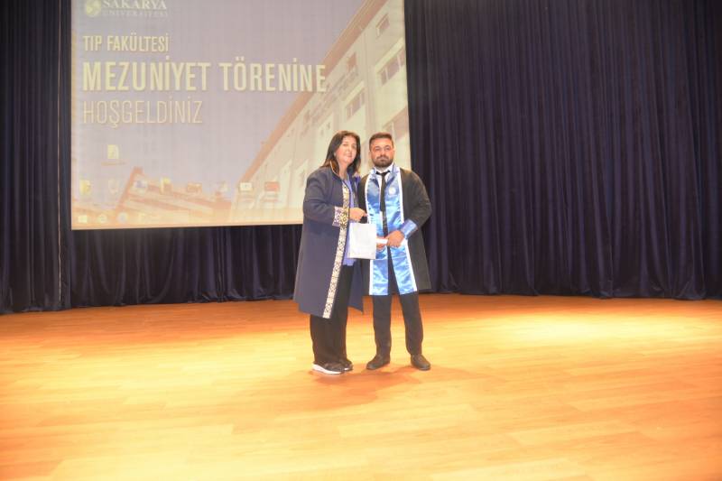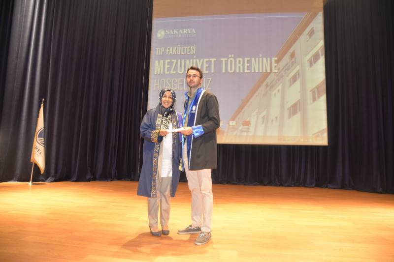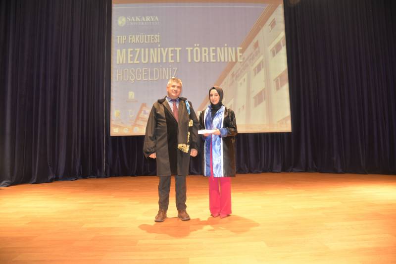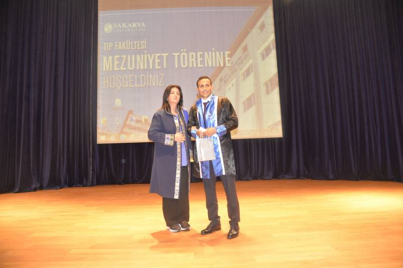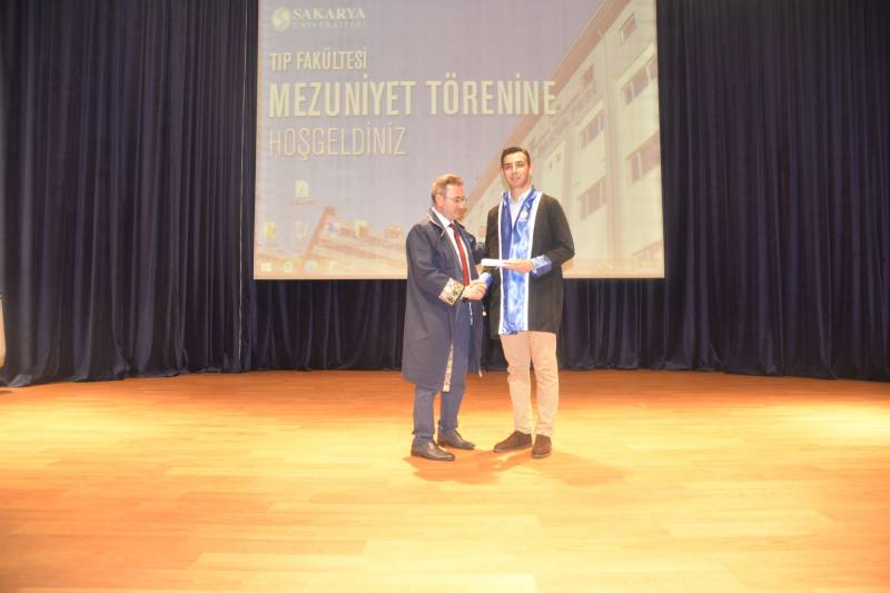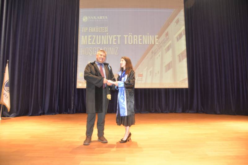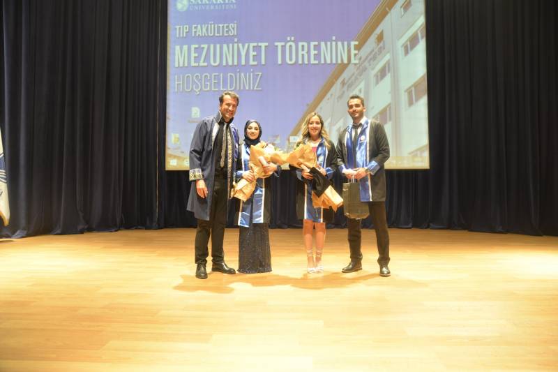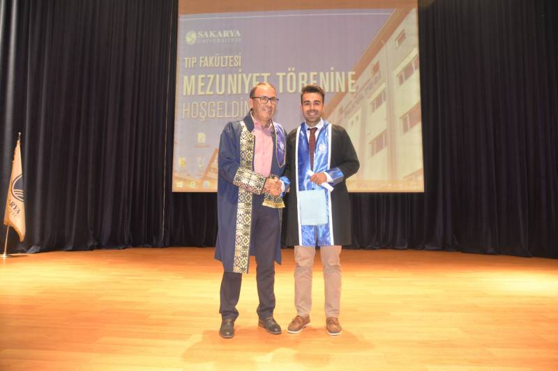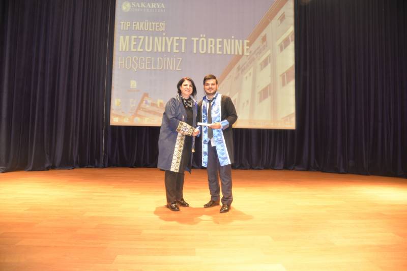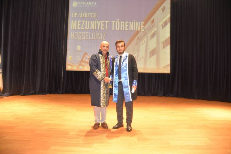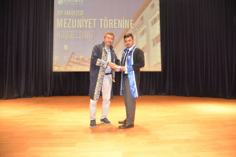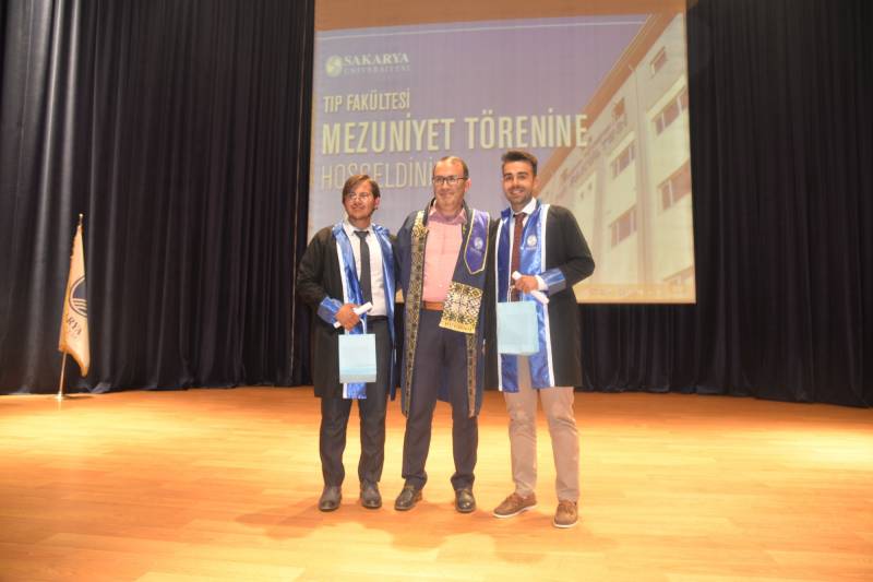 SAÜ Tıp Fakültesi Dekanı OÄŸuz Karabay, “Tıp Fakültemizde yetiÅŸtirdiÄŸimiz 9. mezunlarımızı kutlamak için toplandık. Öncelikle gece gündüz demeden genç doktoralarımızın yanında olan ailelerini tebrik ediyorum. Siz mezunlarımız, adınızın önüne gelen doktor unvanına yakışır davranın; iÅŸinizle öne çıkın, hastanızla aranıza iletiÅŸimsizlik girmesin, meslektaÅŸlarınıza deÄŸer verin.” ÅŸeklinde konuÅŸtu. Uzmanlık sınavında istedikleri yerleri kazanmalarını dileyerek gelecekte mezunlarını doçent ya da profesör olarak görmek istediÄŸini dile getiren Dr. Karabay, “Üniversitemizin kapısı artık meslektaşımız olarak sizlere her zaman açık. Bizler sizi mezun etmenin gururunu yaşıyoruz. Vakit artık, memleket sevdasıyla göstereceÄŸiniz çabaları izleme vaktidir.” ifadelerini kullanarak konuÅŸmasını sonlandırdı.
