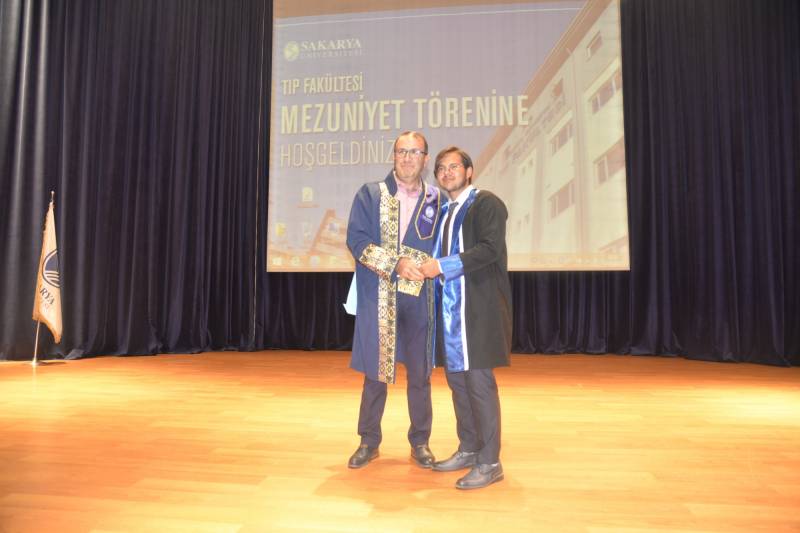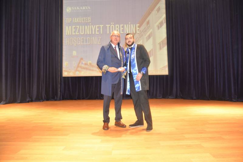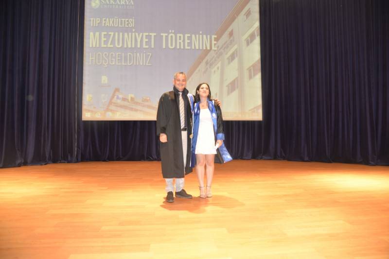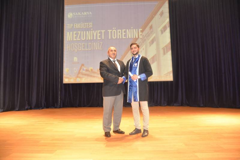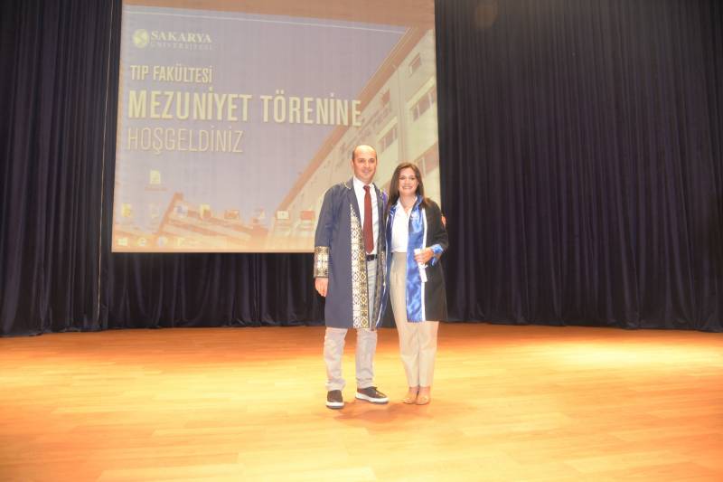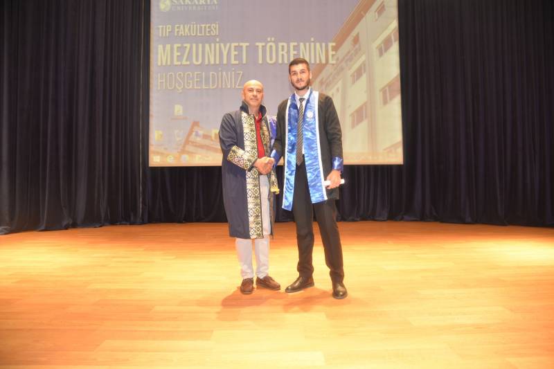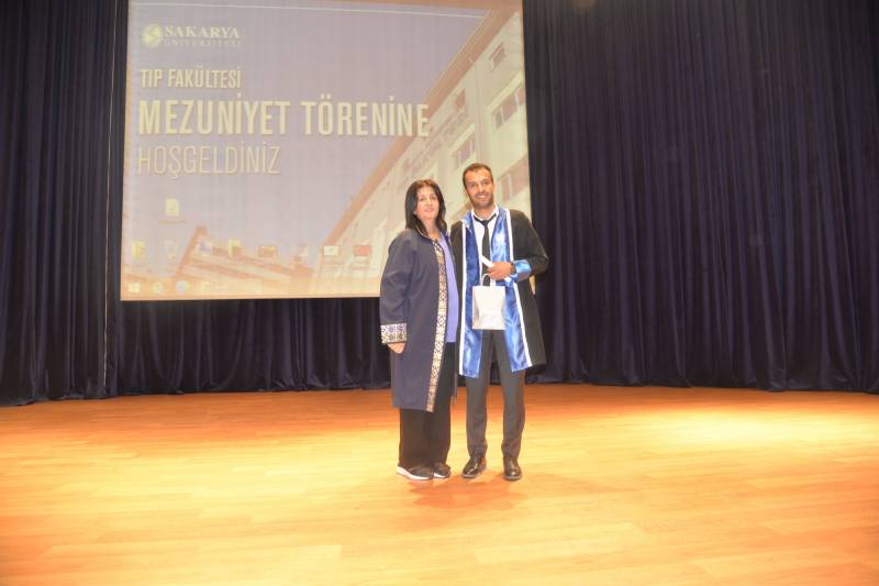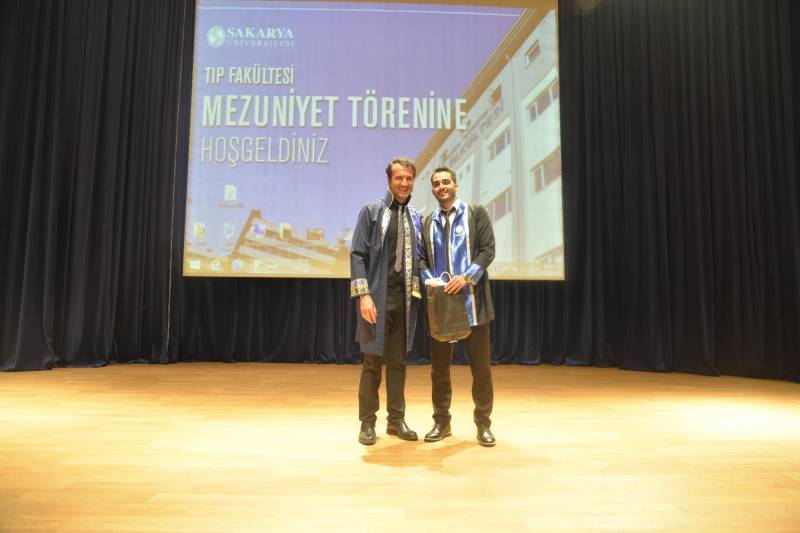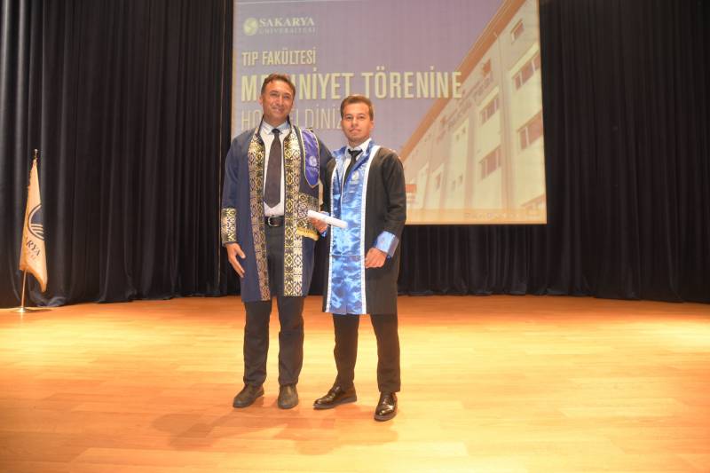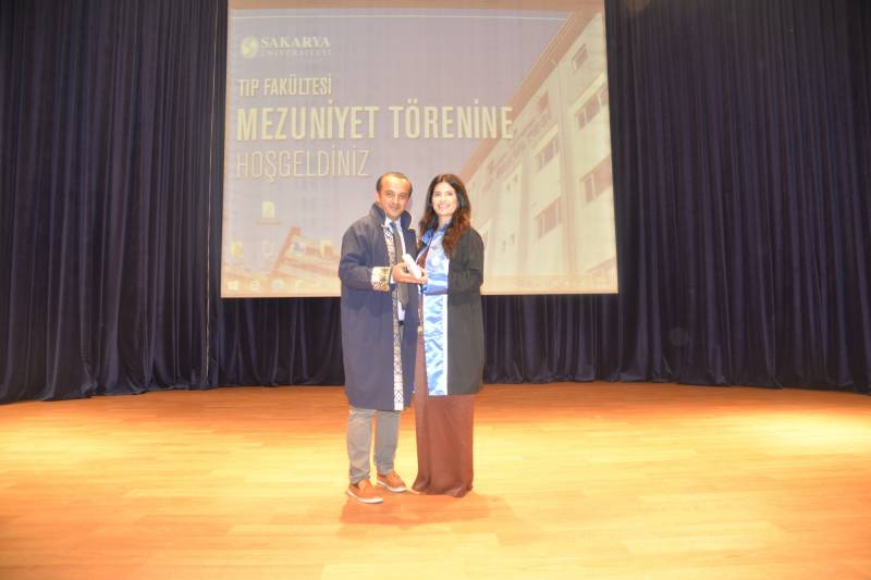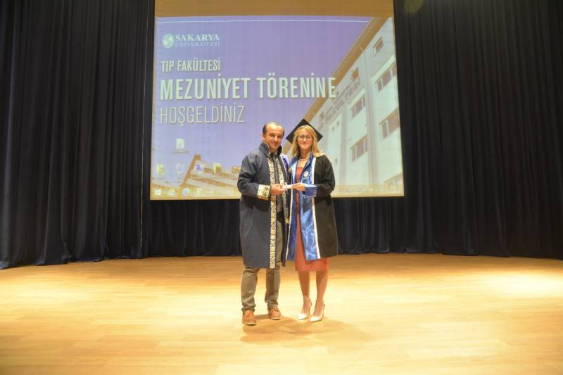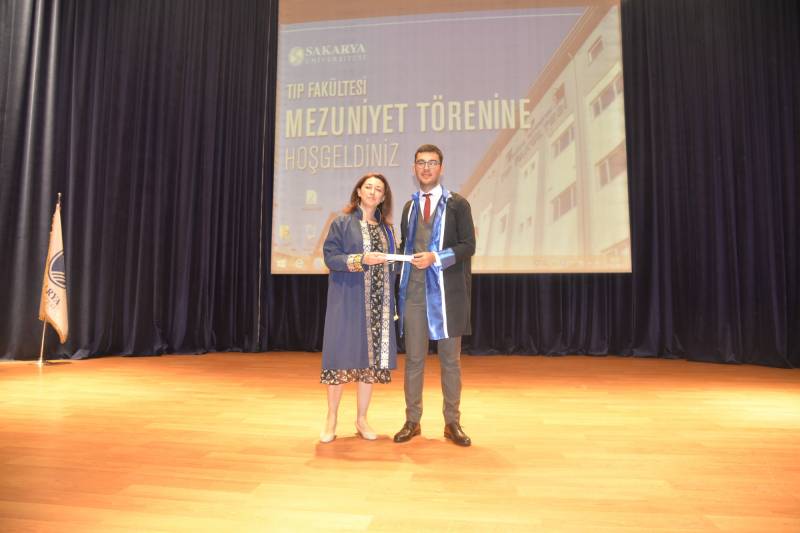 SAÜ Tıp Fakültesi Dekanı OÄŸuz Karabay, “Tıp Fakültemizde yetiÅŸtirdiÄŸimiz 9. mezunlarımızı kutlamak için toplandık. Öncelikle gece gündüz demeden genç doktoralarımızın yanında olan ailelerini tebrik ediyorum. Siz mezunlarımız, adınızın önüne gelen doktor unvanına yakışır davranın; iÅŸinizle öne çıkın, hastanızla aranıza iletiÅŸimsizlik girmesin, meslektaÅŸlarınıza deÄŸer verin.” ÅŸeklinde konuÅŸtu. Uzmanlık sınavında istedikleri yerleri kazanmalarını dileyerek gelecekte mezunlarını doçent ya da profesör olarak görmek istediÄŸini dile getiren Dr. Karabay, “Üniversitemizin kapısı artık meslektaşımız olarak sizlere her zaman açık. Bizler sizi mezun etmenin gururunu yaşıyoruz. Vakit artık, memleket sevdasıyla göstereceÄŸiniz çabaları izleme vaktidir.” ifadelerini kullanarak konuÅŸmasını sonlandırdı.