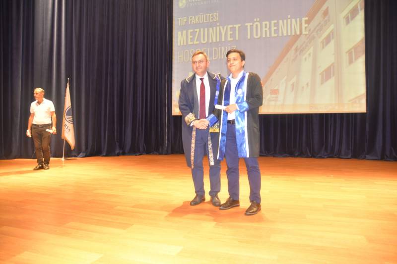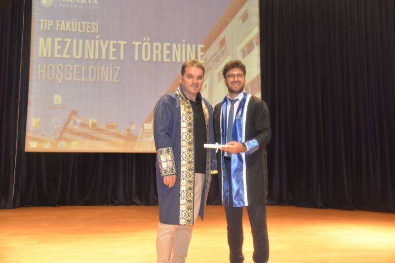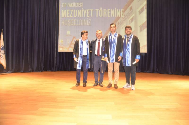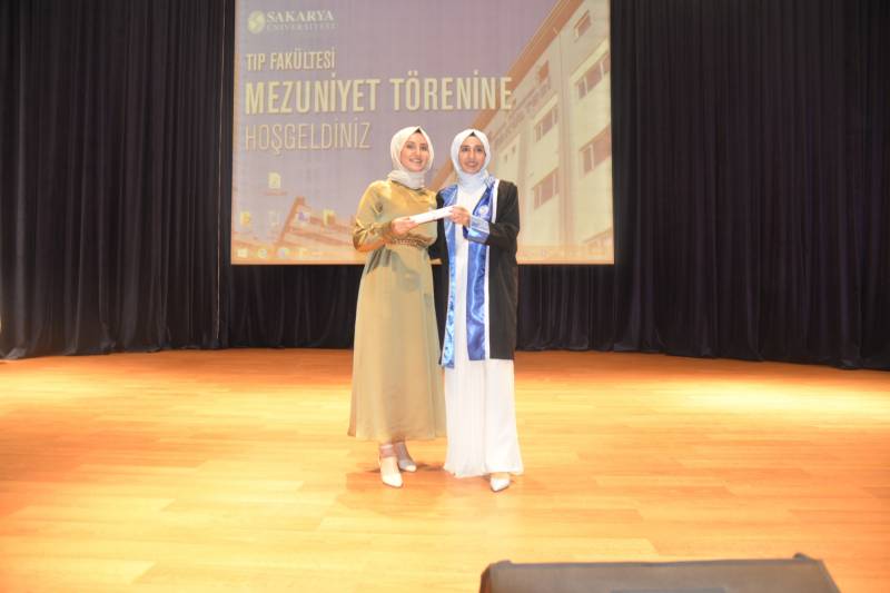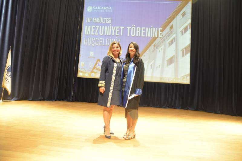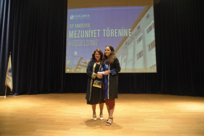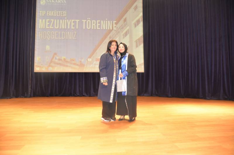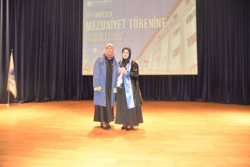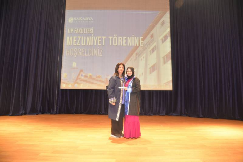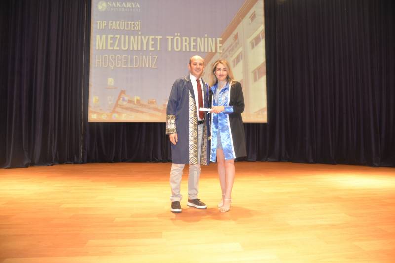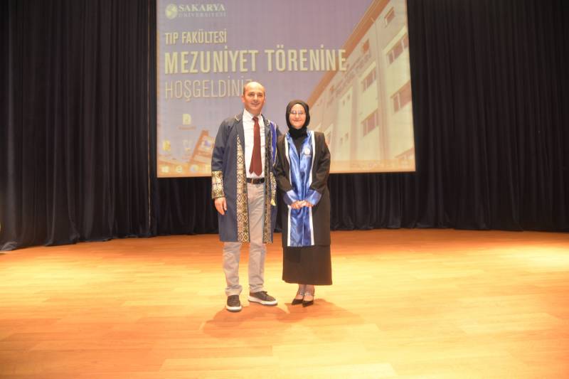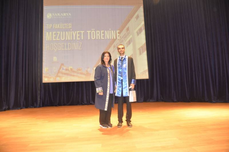 SAÜ Tıp Fakültesi Dekanı OÄŸuz Karabay, “Tıp Fakültemizde yetiÅŸtirdiÄŸimiz 9. mezunlarımızı kutlamak için toplandık. Öncelikle gece gündüz demeden genç doktoralarımızın yanında olan ailelerini tebrik ediyorum. Siz mezunlarımız, adınızın önüne gelen doktor unvanına yakışır davranın; iÅŸinizle öne çıkın, hastanızla aranıza iletiÅŸimsizlik girmesin, meslektaÅŸlarınıza deÄŸer verin.” ÅŸeklinde konuÅŸtu. Uzmanlık sınavında istedikleri yerleri kazanmalarını dileyerek gelecekte mezunlarını doçent ya da profesör olarak görmek istediÄŸini dile getiren Dr. Karabay, “Üniversitemizin kapısı artık meslektaşımız olarak sizlere her zaman açık. Bizler sizi mezun etmenin gururunu yaşıyoruz. Vakit artık, memleket sevdasıyla göstereceÄŸiniz çabaları izleme vaktidir.” ifadelerini kullanarak konuÅŸmasını sonlandırdı.