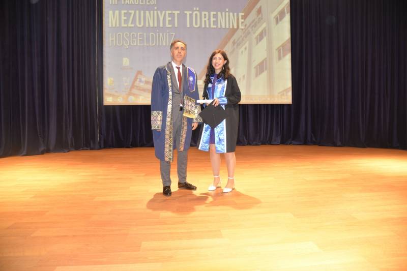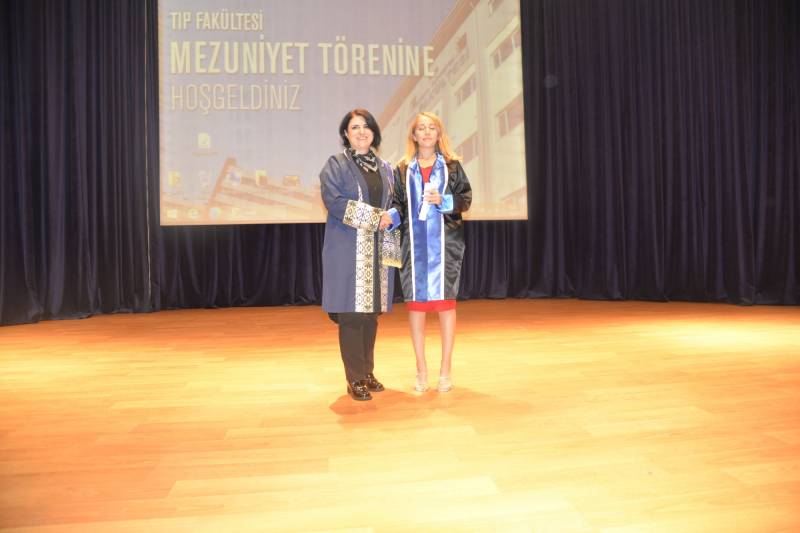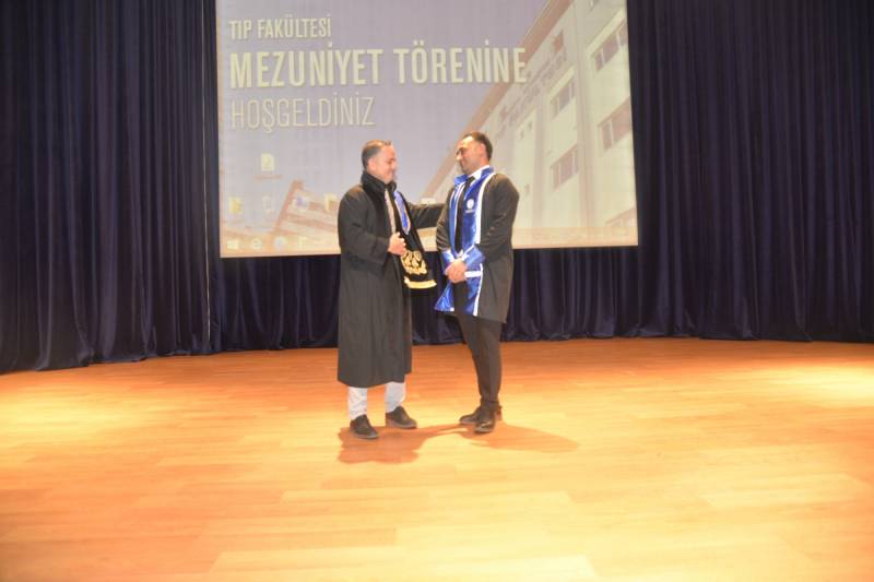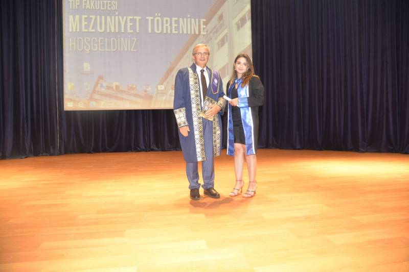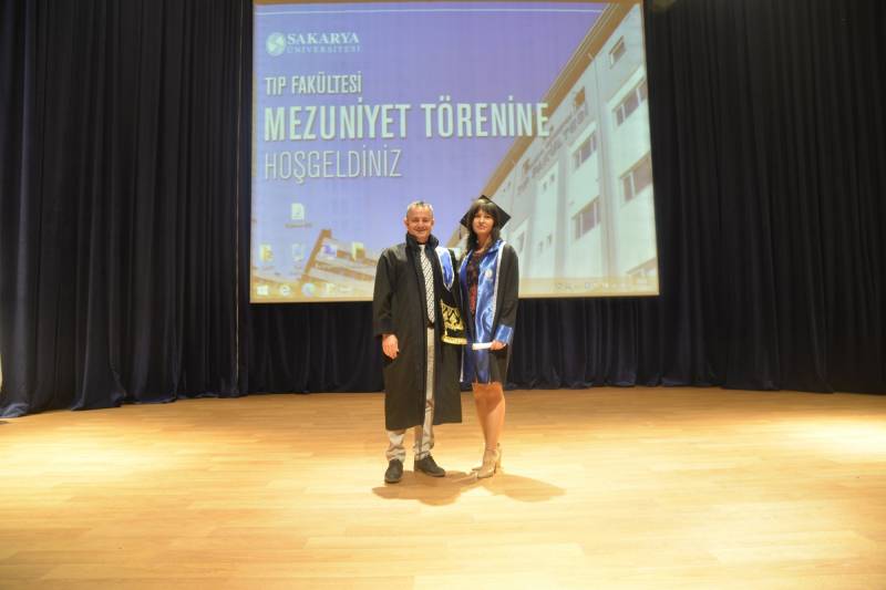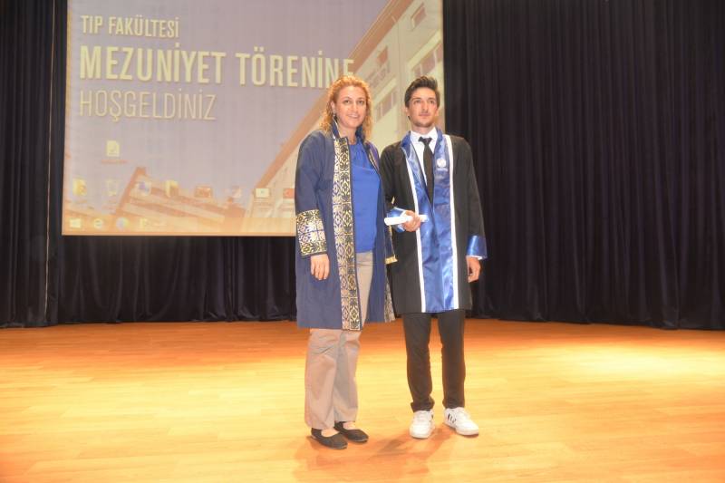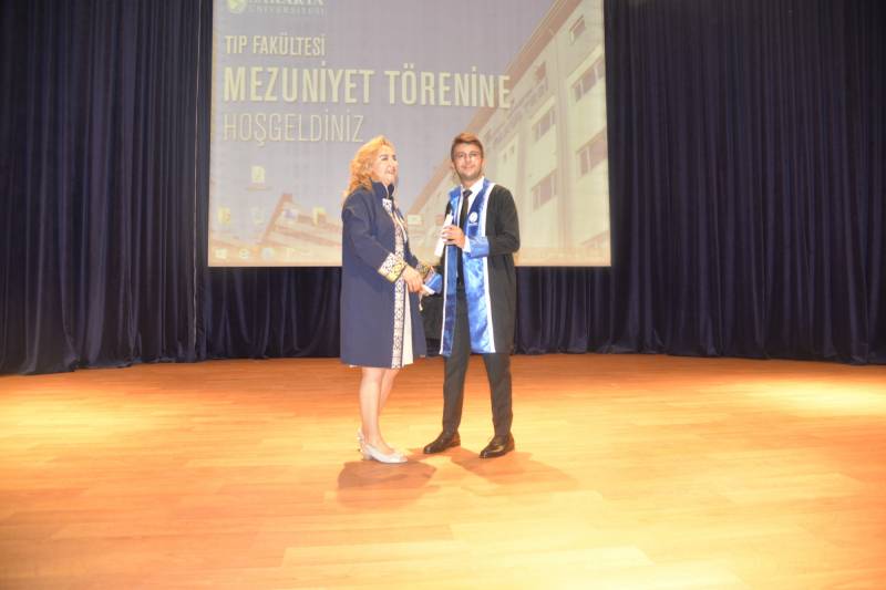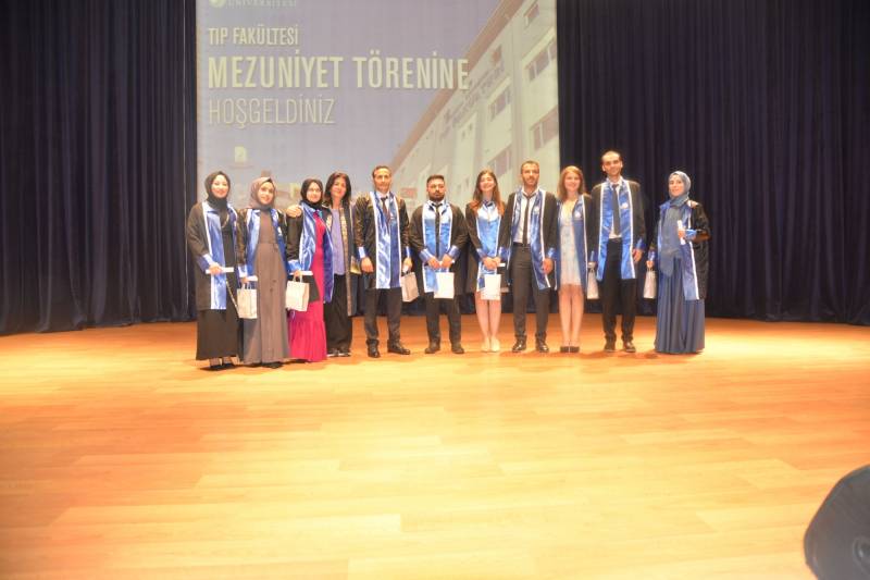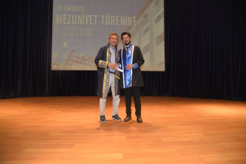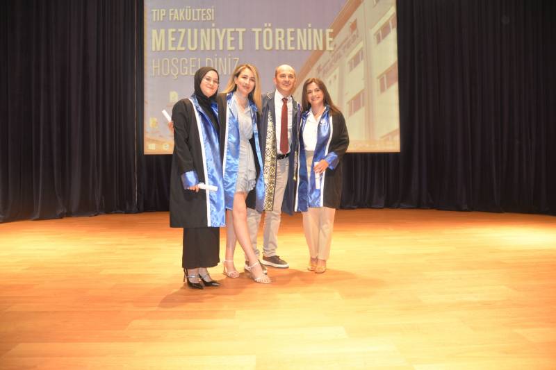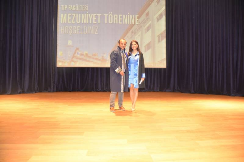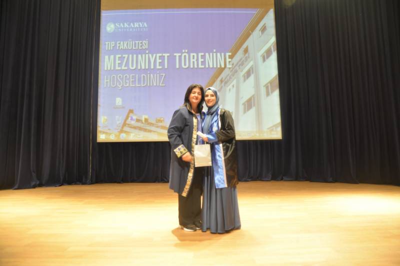 SAÜ Tıp Fakültesi Dekanı OÄŸuz Karabay, “Tıp Fakültemizde yetiÅŸtirdiÄŸimiz 9. mezunlarımızı kutlamak için toplandık. Öncelikle gece gündüz demeden genç doktoralarımızın yanında olan ailelerini tebrik ediyorum. Siz mezunlarımız, adınızın önüne gelen doktor unvanına yakışır davranın; iÅŸinizle öne çıkın, hastanızla aranıza iletiÅŸimsizlik girmesin, meslektaÅŸlarınıza deÄŸer verin.” ÅŸeklinde konuÅŸtu. Uzmanlık sınavında istedikleri yerleri kazanmalarını dileyerek gelecekte mezunlarını doçent ya da profesör olarak görmek istediÄŸini dile getiren Dr. Karabay, “Üniversitemizin kapısı artık meslektaşımız olarak sizlere her zaman açık. Bizler sizi mezun etmenin gururunu yaşıyoruz. Vakit artık, memleket sevdasıyla göstereceÄŸiniz çabaları izleme vaktidir.” ifadelerini kullanarak konuÅŸmasını sonlandırdı.