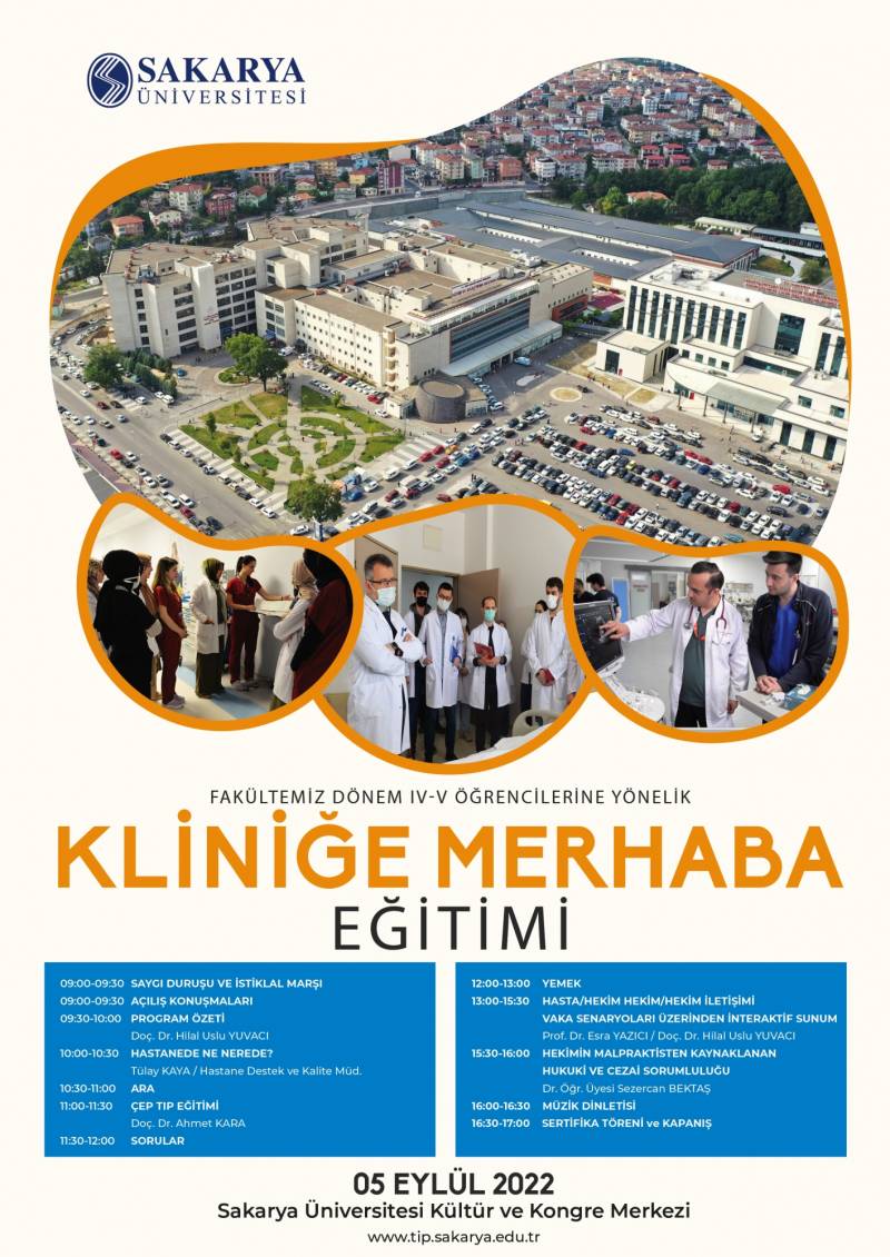 Fakültemiz IV-V sınıf öÄŸrencilerimize yönelik hazırlanan "KLİNİĞE MERHABA EĞİTİMİ" 5 Eylül 2022 saat 09:00-17:00 saatleri arasında Sakarya Üniversitesi Kültür ve Kongre Merkezinde gerçekleÅŸtirilecektir.