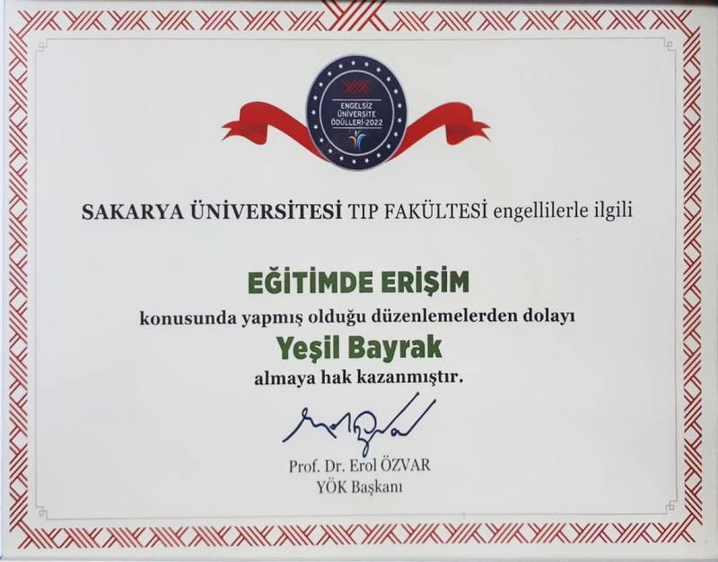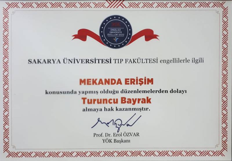 Fakültemize Mekanda ve EÄŸitimde Engellilere yönelik yapılan iyileÅŸtirme çalışmalarından dolayı YükseköÄŸretim Krurmu (YÖK) tarafından MEKANDA ERİŞİME TURUNCU BAYRAK, EĞİTİMDE ERİŞİME YEŞİL BAYRAK verilmiÅŸtir.