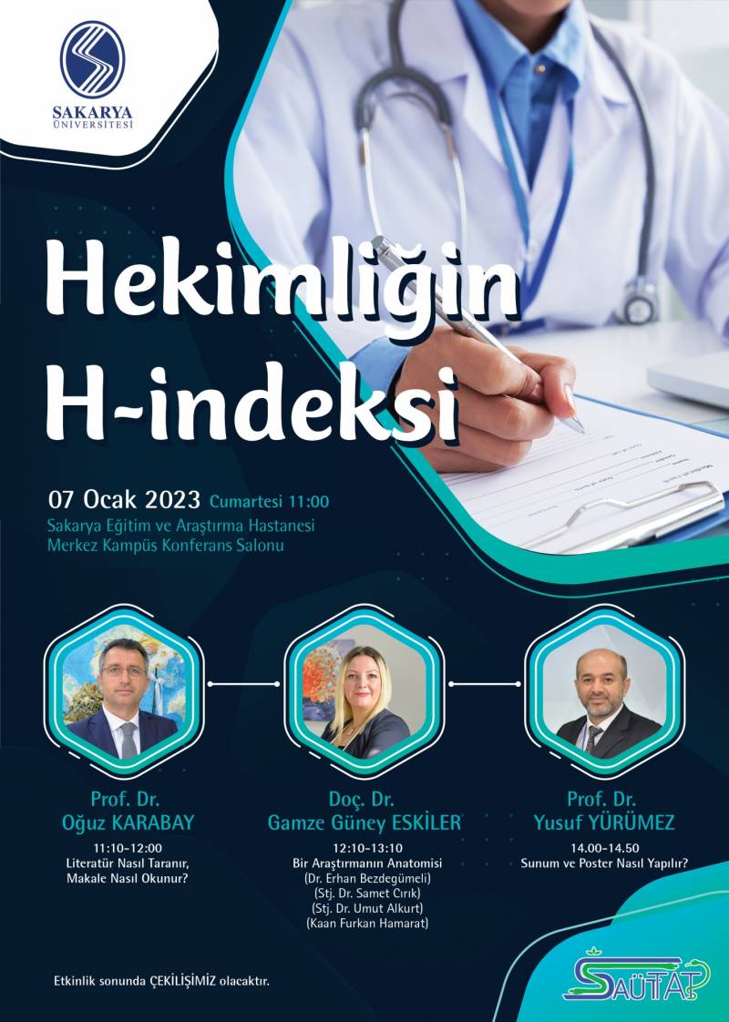 Fakültemiz Sakarya Üniversitesi Tıp Fakültesi Tıbbi AraÅŸtırma TopluluÄŸu(SAÜTTAT) tarafından 7 Ocak 2023 Cumartesi günü "HekimliÄŸin H-İndeksi" konulu bir etkinlik düzenlenecektir.