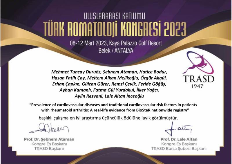 8-12 Mart 2023 tarihinde düzenlenen Uluslarası Katılımlı Türk Romatoloji Kongresi'nde (TRASD) Fiziksel Tıp ve Rehabilitasyon kliniÄŸinde Prof. Dr. İbrahim TekeoÄŸlu, Prof. Dr. Ayhan Kamanlı ve Prof. Dr. Kemal Nas tarafından yapılan ''Psöriatik Artritli Hastalarda Göz Tutulumu ve Klinik Bulgularla İliÅŸkisi: Çok merkezli TRASD-Network Çalışması'' ve ''Prevalence of cardiovascular diseases and traditional cardiovascular risk factors in patients with rheumatoid arthritis: A real-life evidence from BioStaR nationwide registry'' çalışması ile iki ödüle layık görüldü. Hocalarımızı emeklerinden ötürü tebrik eder ve baÅŸarılının devamını dileriz