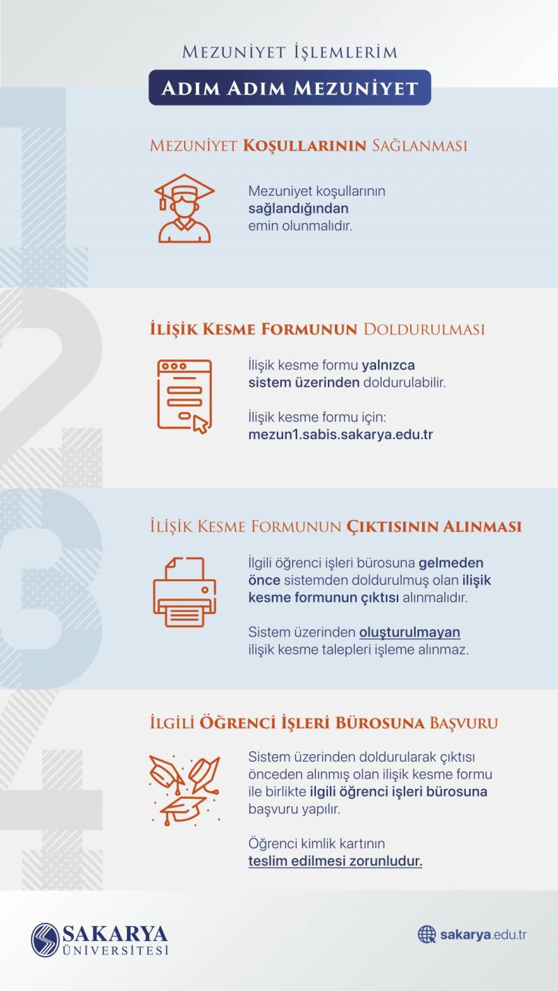 Mezuniyet iÅŸlemleri için https://mezun1.sabis.sakarya.edu.tr/ adresine giriÅŸ yapılarak Mezuniyet Anketinin doldurulması ve sonraki adımda iliÅŸik kesme formunda ilgili alanların doldurularak çıktısının alınması gerekmektedir.