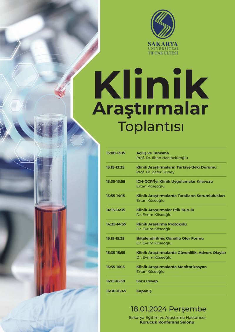 Sakarya Üniversitesi Tıp Fakültesi Rıbbi Onkoloji Bilim Dalı tarafından 18 Ocak 2024 tarihinde Sakarya EÄŸitim ve AraÅŸtırma Hastanesi Korucuk Kampüsü Konferans Salonunda saat 13:00'da "Klinik AraÅŸtırmalar Toplantısı" gerçekleÅŸtirilecektir