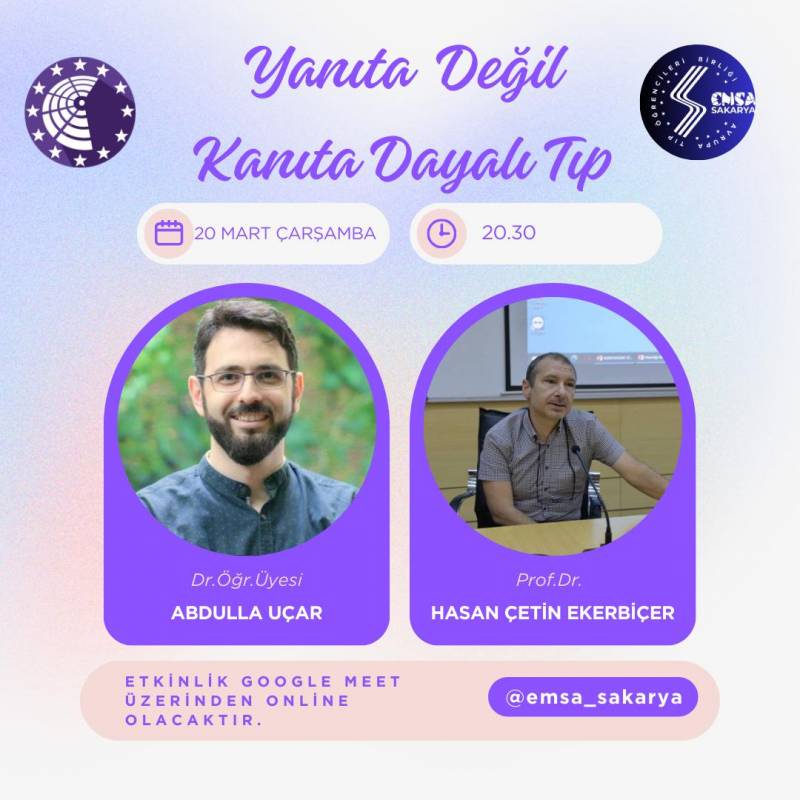EMSA ÖÄŸrenci TopluluÄŸu tarafından 20 Mart 2024 ÇarÅŸamba günü saat 20:30 da Google Meet üzerinden SaÄŸlık Politikaları Piarı olarak düzenleyeceÄŸimiz *"Yanıta DeÄŸil Kanıta Dayalı Tıp"* adkı etkinliÄŸimizde Dr. ÖÄŸr. Üyesi Abdullah Uçar ve Prof. Dr. Hasan Çetin Ekerbiçer hocamızla tıbba farklı yönden bakacağız.
