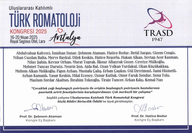 Fakültemiz öÄŸretim üyelerinden Prof. Dr. Ayhan Kamanlı ve Prof. Dr. Kemal Nas, 17-20 Nisan 2025 tarihlerinde düzenlenen Türk Romatoloji Kongresinde sundukları bilimsel çalışma ile Sözlü Sunum Birincilik Ödülüne layık görülmüÅŸlerdir.
