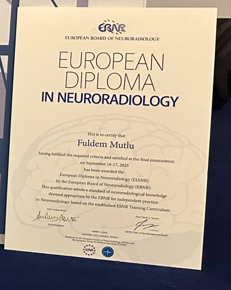 Sakarya Üniversitesi Tıp Fakültesi Radyoloji Anabilim Dalı ÖÄŸretim Üyesi Doç. Dr. Fuldem Mutlu, Avrupa Nöroradyoloji Kurulu (EBNR) ve Avrupa Tıp Uzmanları BirliÄŸi (UEMS) tarafından Avrupa Nöroradyoloji Diploması ile ödüllendirilmiÅŸtir. Bu yeterlilik belgesi, Avrupa Nöroradyoloji DerneÄŸi (ESNR) eÄŸitim müfredatına dayanarak Avrupa Nöroradyoloji Kurulu (EBNR) tarafından bağımsız Nöroradyoloji uygulaması için uygun görülen bilgi standartını belgelemektedir. Her biri ayrı Avrupa ülkesinde, 6 ay aralıkla yapılan toplamda 6 sınavı baÅŸarılı bir ÅŸekilde geçerek elde ettiÄŸi büyük baÅŸarısından ötürü Tıp Fakültesi olarak Doç. Dr. Fuldem Mutlu’yu tebrik ediyor, baÅŸarılarının devamını diliyoruz.
