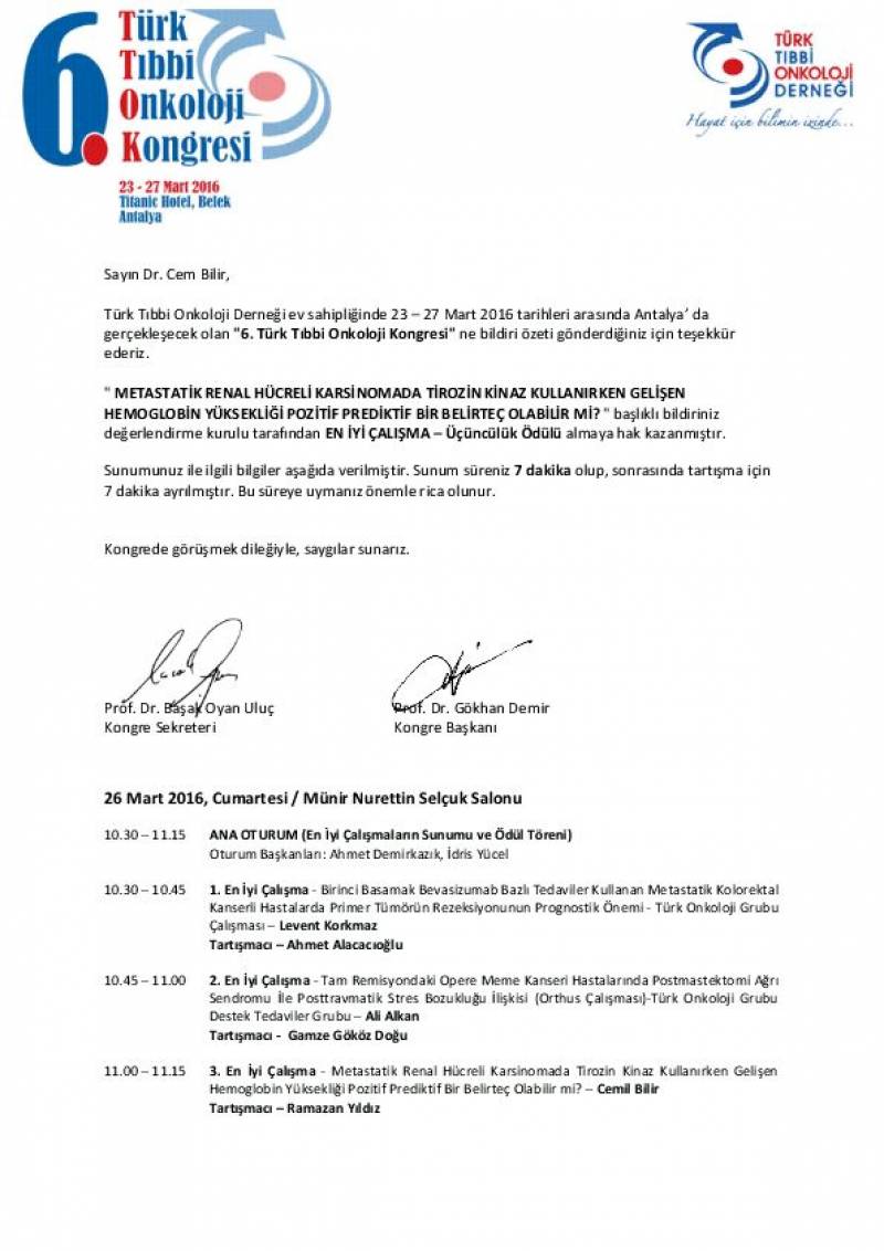 Türk Tıbbi Onkoloji DerneÄŸi ev sahipliÄŸinde 23-27 Mart 2016 tarihleri arasında Antalya'da gerçekleÅŸecek olan "6. Türk Tıbbi Onkoloji Kongresi"ne bildiri özeti gönderen Sakarya Üniversitesi Tıp Fakültesi Dahili Bilimler Bölümü İç Hastalıkları Anabilim Dalı öÄŸretim Üyesi Doç. Dr. Cemil BİLİR "METASTATIK RENAL HÜCRELi KARSINOMADA TiROZINKiNAZ KULLANlRKEN GELIÅžEN HEMOGLOBIN YÜKSEKLiÄži POZİTİF PREDİKTİF BiR BELiRTE ÇOLABiliR Mi? " baÅŸlıklı bildirisi ile deÄŸerlendirme kurulu tarafından EN İYİ ÇALIÅžMA - Üçüncülük Ödülü almaya hak kazanmıştır.