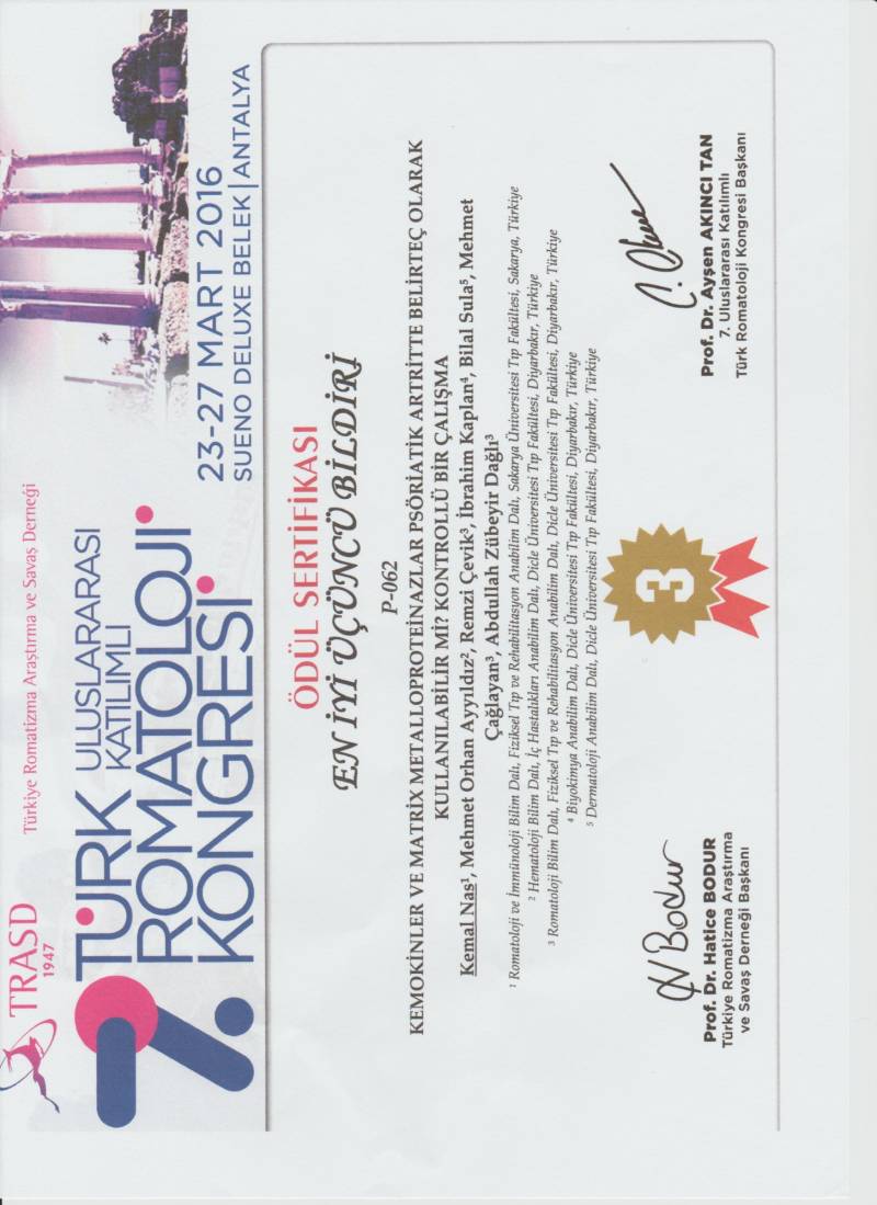 Türkiye Romatizma AraÅŸtırma ve SavaÅŸ DerneÄŸi tarafından 23-27 Mart 2016 tarihleri arasında 7.si düzenlenen Uluslararası Katılımlı Türk Romatoloji Kongresinde Sakarya Üniversitesi Tıp Fakültesi Romatoloji ve İmmünoloji Bilim Dalı, Fiziksel Tıp ve Rehabilitasyon Anabilim Dalı ÖÄŸretim Üyesi Prof. Dr. Kemal NAS “Kemokinler ve Matrix Metalloproteinazlar Psöriatik Artritte Belirteç Olarak Kullanılabilir Mi? baÅŸlıklı bildirisiyle en iyi üçüncü bildiri ödülünü almıştır.