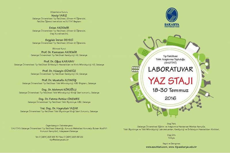 Tıp Fakültesi Dönem-II ye yeni geçen öÄŸrencilere, gönüllülük esasına göre, yaz tatilini deÄŸerlendirmek üzere, SaÄŸlık Bakanlığı Sakarya Üniversitesi EÄŸitim ve AraÅŸtırma Hastanesi Merkez Kampüs laboratuvarı ile genel bazı laboratuarların tanı cihazlarının ve ortamın tanıtılmasına yönelik bir YAZ STAJ PROGRAMI düzenlenmiÅŸtir.