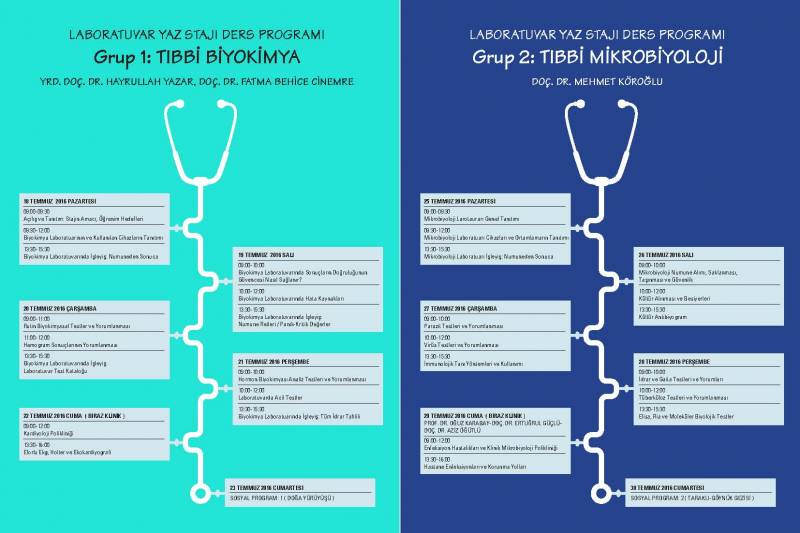 Program 18-30 Temmuz 2016 tarihleri arasında 2 hafta süreyle Tıbbi Biyokimya ve Tıbbi Mikrobiyoloji Laboratuarları, Kardiyoloji ve Enfeksiyon Hastalıkları Kliniklerinde gerçekleÅŸtirilecektir.