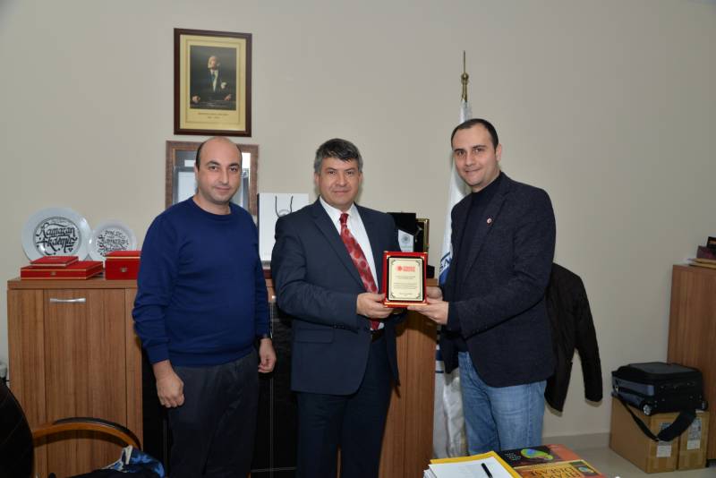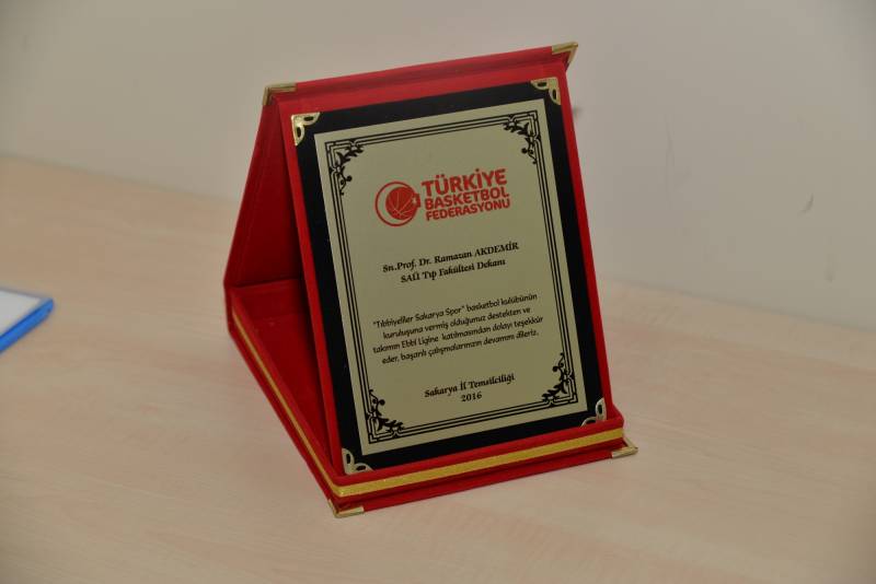 GörüÅŸmelerinin ardından Türkiye Basketbol Federasyonu Sakarya İl Temsilcisi Alpay ALEV ve İl Hakem Kurulu Üyesi ÇaÄŸrı MUTİ, Dekan Prof. Dr. Ramazan AKDEMİR’e teÅŸekkür plaketi takdim ettiler.