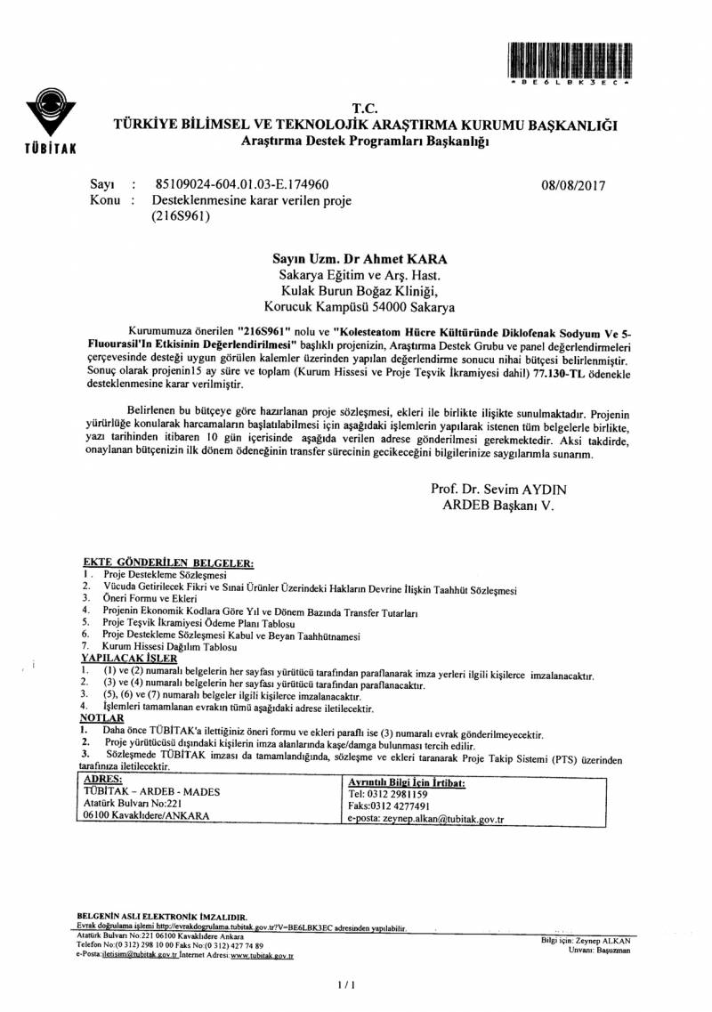 Sakarya Üniversitesi EÄŸitim ve AraÅŸtırma Hastanesi Kulak Burun BoÄŸaz KliniÄŸi Yrd. Doç. Dr. Ahmet KARA'ntn Kolesteatom Hücre Küitüründe Diklofenak Sodyum ve 5-Fluourasil’la Etkisinin DeÄŸerlendirilmesi baÅŸlıklı projesi TÜBİTAK AraÅŸtırma Destek Programları BaÅŸkanlığı AraÅŸtırma Destek Grubu ve Panel DeÄŸerlendirmeleri çerçevesinde desteÄŸe layık görülmüÅŸtür.