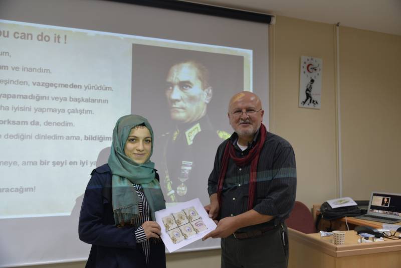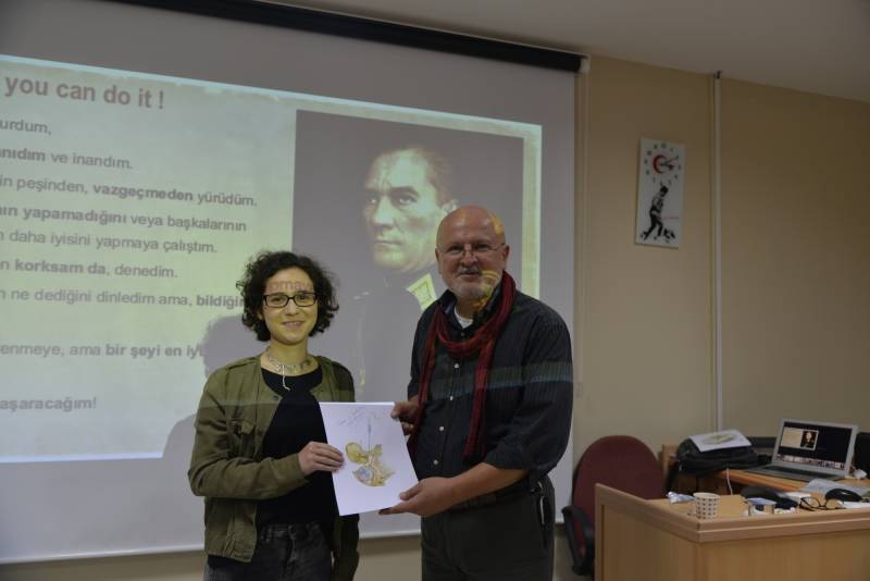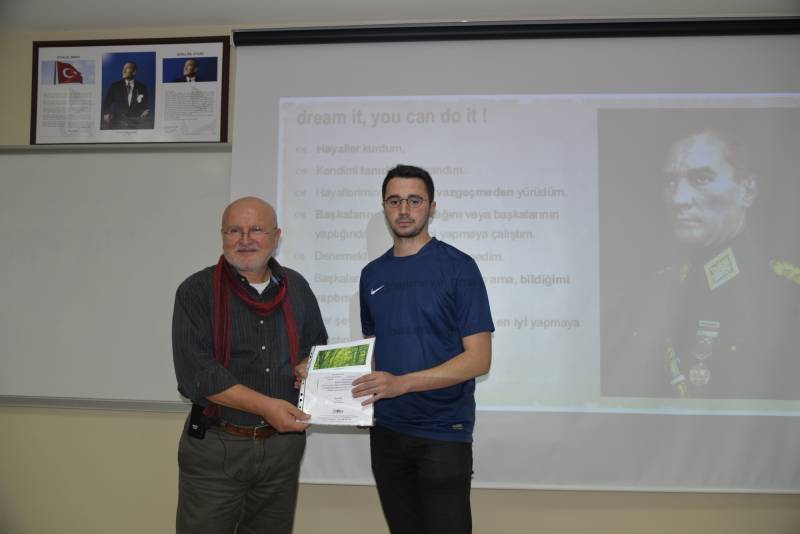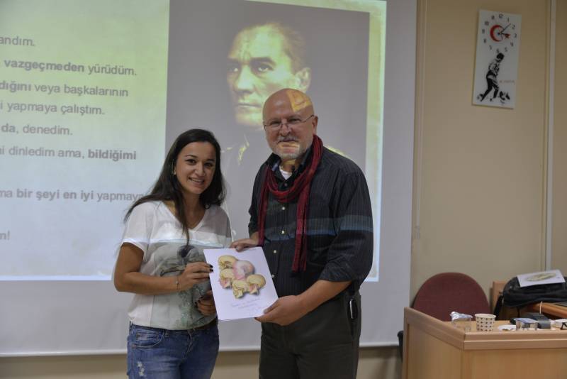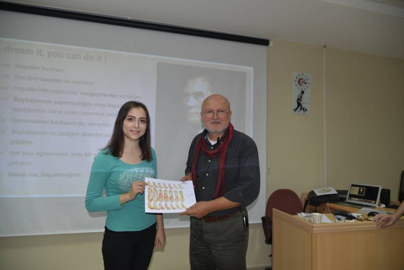 Konferans sonrası yapılan çekiliÅŸ ile 5 ÅŸanslı öÄŸrenciye Prof. Dr. Ahmet SINAV kendi el çizimi anatomi resimlerini öÄŸrencilere imzalayarak hediye etti.