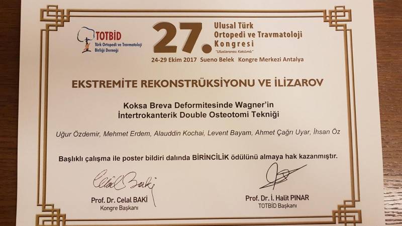 Türk Ortopedi ve Travmatoloji BirliÄŸi DerneÄŸi (TOTBİD) tarafından 24-29 Ekim 2017 tarihleri arasında düzenlenen Uluslararası katılımlı 27. Ulusal Türk Ortopedi ve Travmatoloji Kongresinde UÄŸur Özdemir, Memmet Erdem, Alauddin Kochai, Levent Bayram, Ahmet ÇaÄŸrı Uyar, İhsan Öz tarafından hazırlanan "Koksa Breva Deformitesinde Wagner'in İntertrokanterik Double Osteotomi TekniÄŸi" baÅŸlıklı çalışma poster bildiri dalında 1.lik ödülü almıştır.
