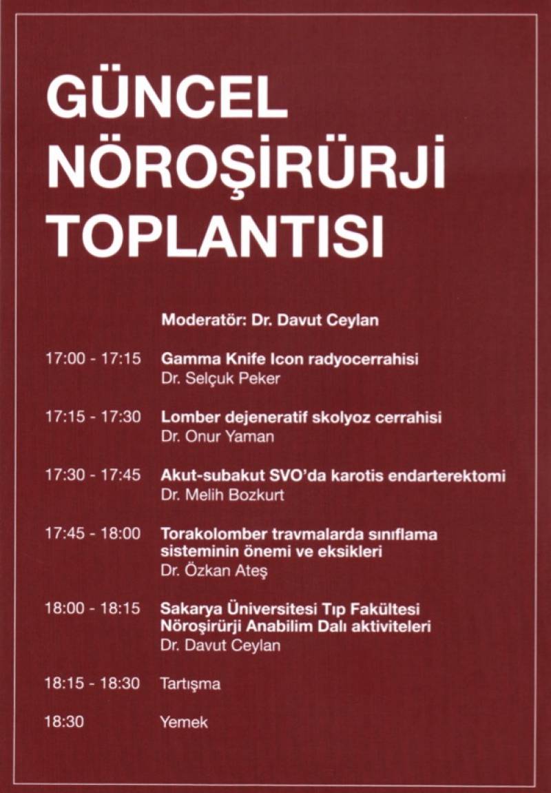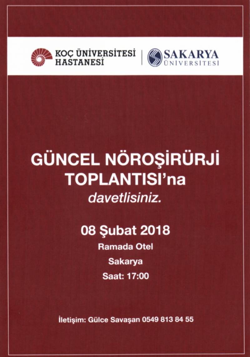 Sakarya Üniversitesi Tıp Fakültesi ile Koç Üniversitesi Hastanesi tarafından ortaklaÅŸa gerçekleÅŸtirilecek olan Güncel NöroÅŸirürji Toplantısı 8Åžubat 2018 PerÅŸembe günü Ramada Otelde gerçekleÅŸtirilecektir
