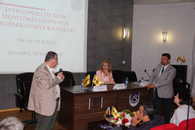 'Endokrin Cerrahisi DerneÄŸi veSAÜ EÄŸitim AraÅŸtırma Hastanesi Genel Cerrahi Anabili Dalı iÅŸbirliÄŸi ile 'Sakarya Tiroid Okulu' programı 5 Mayıs 2018'de gerçekleÅŸtirildi. Sakarya ve çevre ÅŸehirlerden gelen meslektaÅŸlarımızla panelde 'tiroid nodüllerine yaklaşım' tartışıldı, 'intraoperatif sinir monitorizasyonunun tiroidektomiye katkıları' sunuldu. Ardından canlı ameliyat yayınında süreli vagus uyarısı ile total tiroidektomi uygulandı. Programın sonunda Endokrin Cerrahisi DerneÄŸi ve panelistlere teÅŸekkür plaketleri sunuldu.'