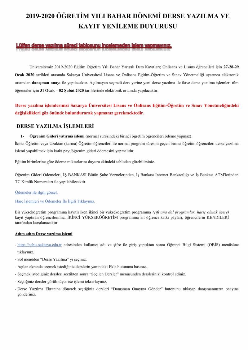 Üniversitemiz 2019-2020 EÄŸitim ÖÄŸretim Yılı Bahar Yarıyılı Ders Kayıtları; Önlisans ve Lisans öÄŸrencileri için 27-28-29 Ocak 2020 tarihleri arasında Sakarya Üniversitesi Lisans ve Önlisans EÄŸitim-ÖÄŸretim ve Sınav YönetmeliÄŸi uyarınca elektronik ortamdan danışman onayı ile yapılacaktır. Açılmayan seçmeli ders yerine yeni derse yazılma ile ilave derse yazılma iÅŸlemleri tüm öÄŸrenciler için 31 Ocak – 02 Åžubat 2020 tarihlerinde elektronik ortamda yapılacaktır.