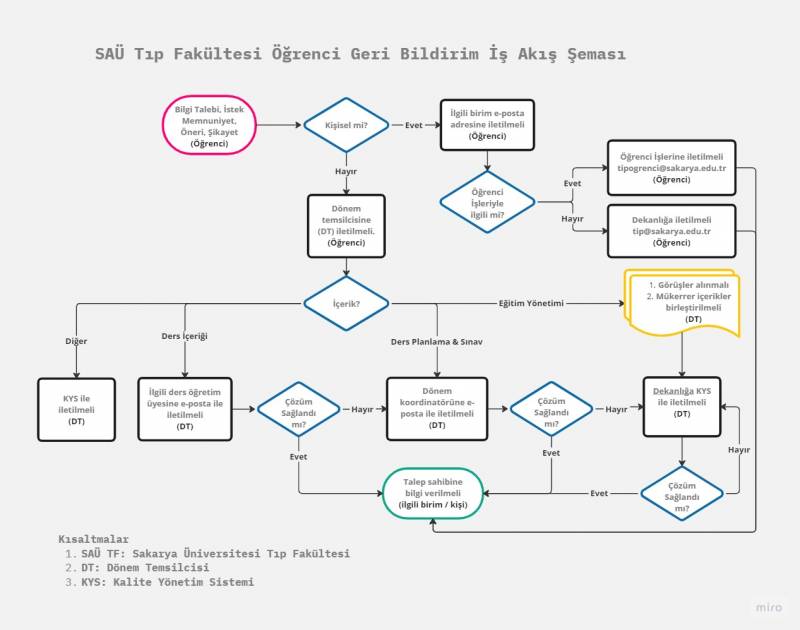 Merhabalar deÄŸerli öÄŸrencimiz; Sakarya Üniversitesi Tıp Fakültesi mensubu öÄŸrencilerimizin fakülte yönetsel organları ile iletiÅŸiminin saÄŸlıklı bir ÅŸekilde saÄŸlanması kurumsal iÅŸleyiÅŸimizde önemli ve merkezi bir yere sahiptir. Bu sebeple kiÅŸisel veya genel düzeyde bilgi, istek, memnuniyet, öneri, ÅŸikayet vb içerikli geri bildirimlerinizin aÅŸağıdaki ÅŸemada belirtilen iÅŸ akış ÅŸemasına göre yürütülmesi, bildiriminizin muhatabına ulaÅŸması ve çözüm saÄŸlanabilmesi adına önem arz etmektedir.